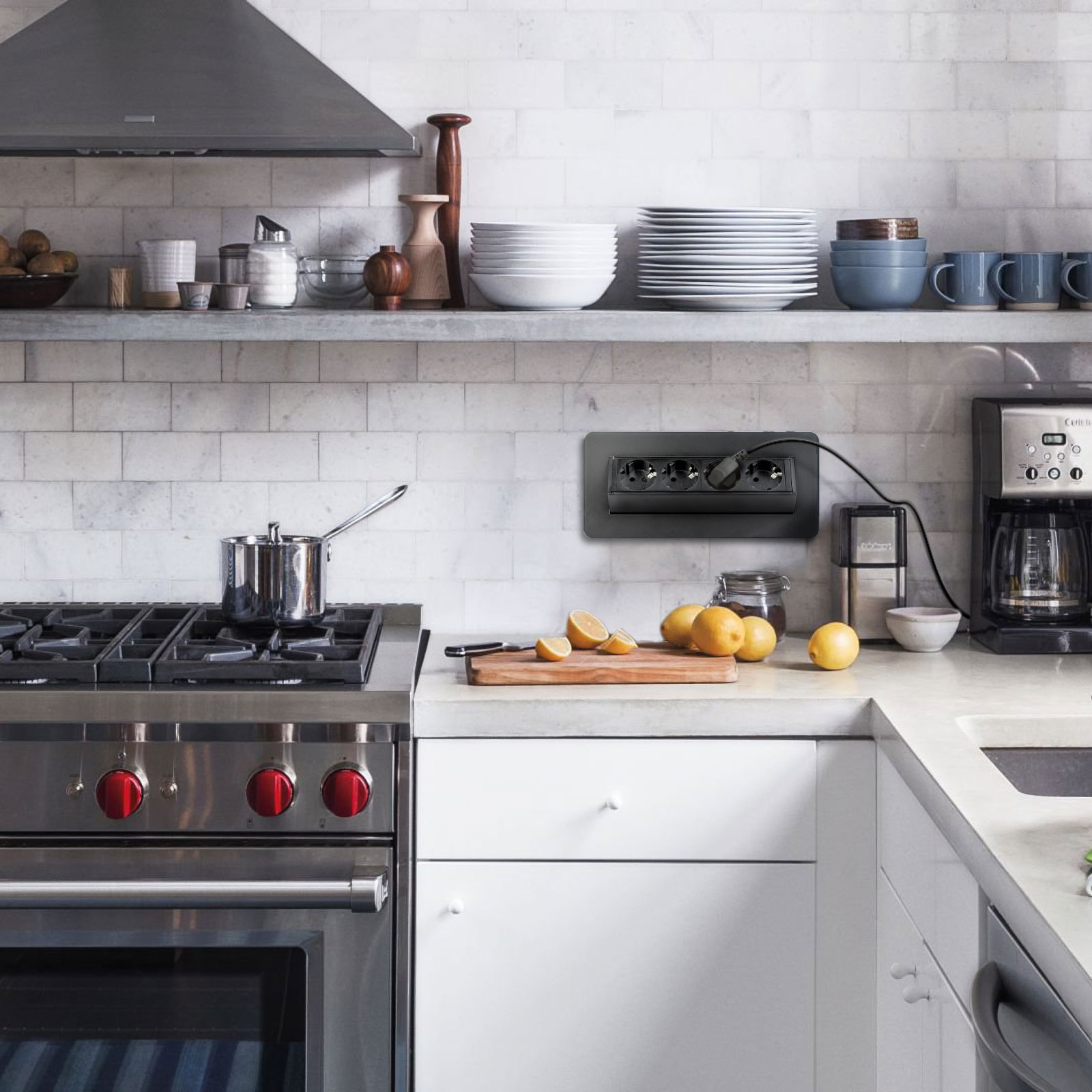 Dispune de 4 prize cu protecție pentru copii și de un mecanism rabatabil tip „flip-up”, care permite deschiderea și închiderea ușoară atunci când este nevoie de alimentare. Când nu este utilizat, prelungitorul se integrează perfect în suprafața blatului, menținând un aspect ordonat și elegant.