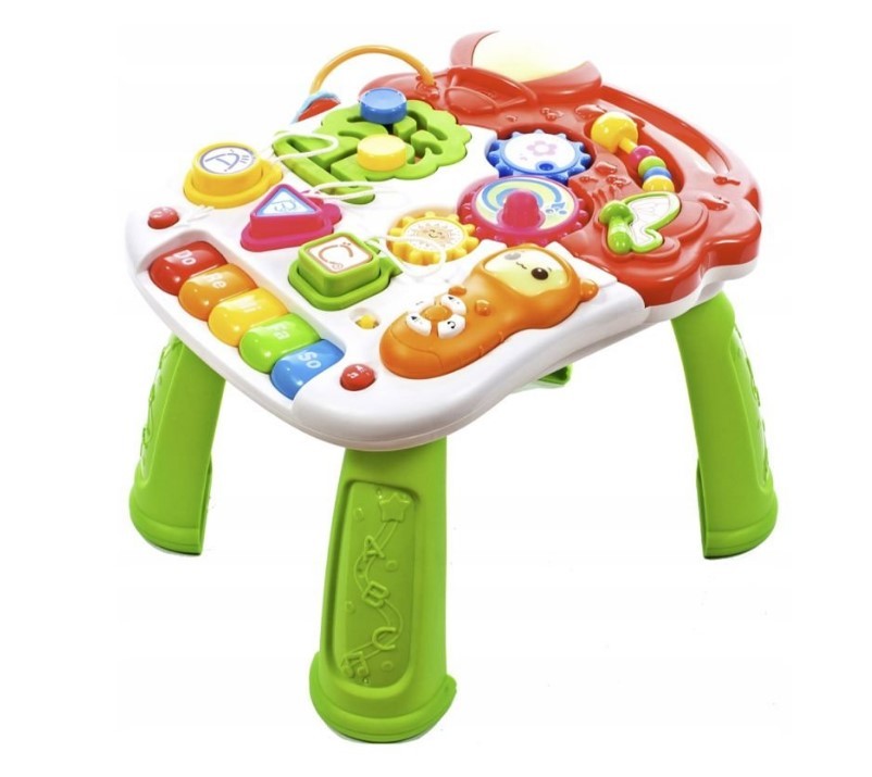 Masuta de activitati include diverse jucarii interactive care stimuleaza simturile si contribuie la dezvoltarea abilitatilor motorii fine, fiind o solutie ideala pentru invatare prin joaca. Include un pian muzical, forme geometrice cu litere ABC, o rotita, un arbore labirint, o omida cu margele si o telecomanda detasabila cu sunete.