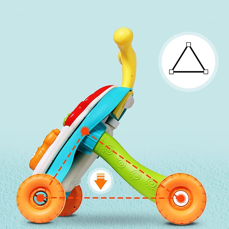 Cele patru roti au doua viteze ajustabile, respectiv lent si rapid, permitand adaptarea la nivelul de dezvoltare al copilului si oferind o stabilitate excelenta. In plus, au un sistem de blocare a rotilor din spate pentru securitate suplimentara. Pe partea inferioara se afla un rezervor care poate fi umplut cu apa sau nisip pentru a asigura greutatea necesara stabilitatii. Aceste caracteristici ajuta la imbunatatirea echilibrului si a coordonarii, sustinand micutul in primele sale incercari de a face pasi.
