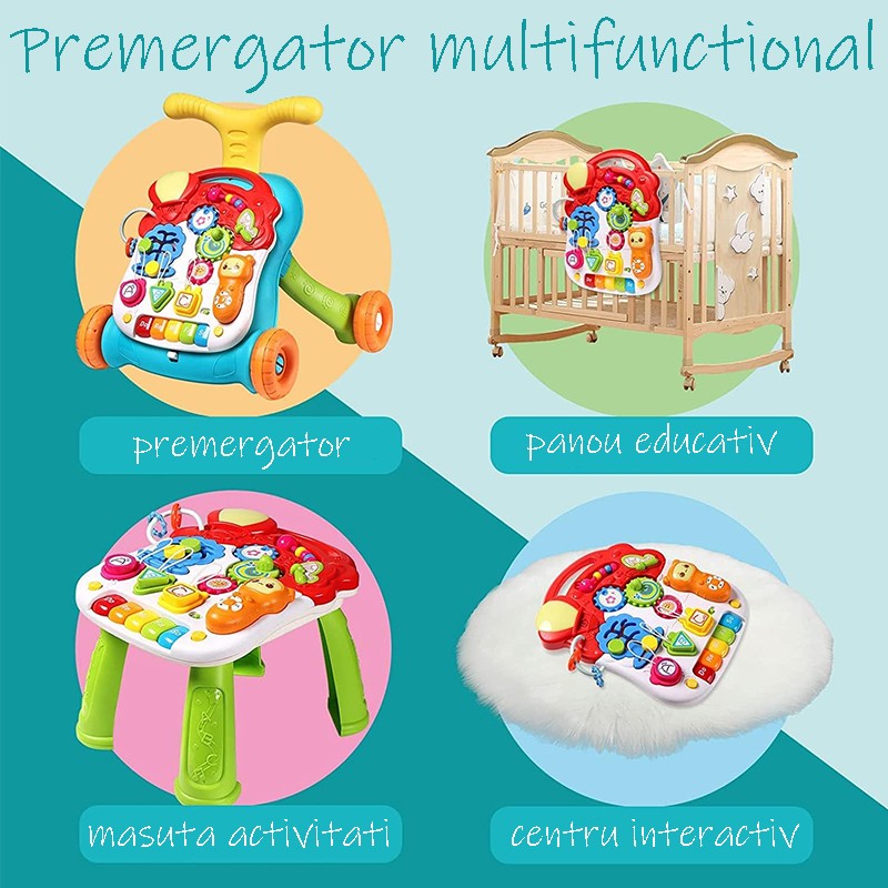 Premergator interactiv multifunctional, masuta activitati, efecte sonore, maner reglare inaltime, 2 viteze ajustabile