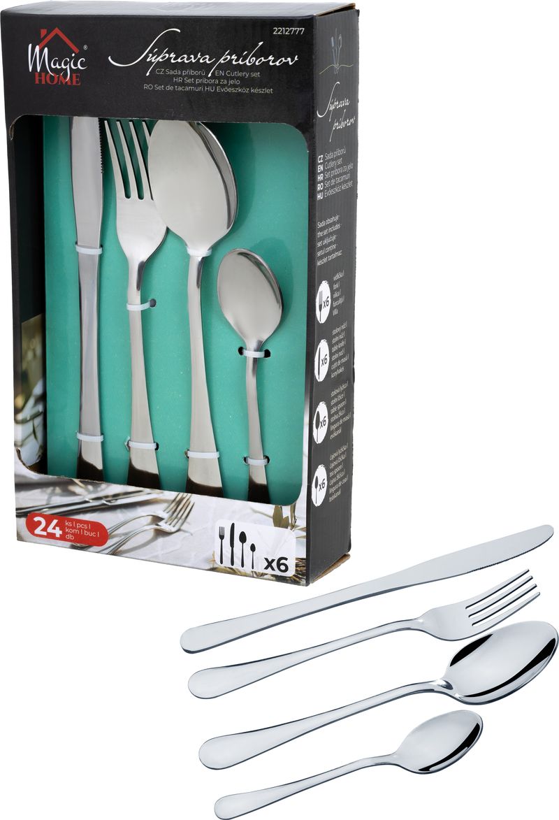24-dielna súprava príborov MagicHome pozostáva zo 6 nožov, 6 jedálenských lyžíc, 6 vidličiek a 6 čajových lyžičiek, takže je skvelou voľbou pre každú rodinu. Príbor má jednoduchý, elegantný dizajn bez zbytočných vzorov, ktorý je nadčasovo krásny a ideálny na akúkoľvek neformálnu či slávnostnú príležitosť. Súprava príborov je vhodná na umývanie v umývačke riadu a ľahko sa čistí. Dĺžka jednotlivých príborov : nôž - 22,4 cm, lyžica - 19,3 cm, vidlička - 19,5 cm a lyžička - 13,9 cm.