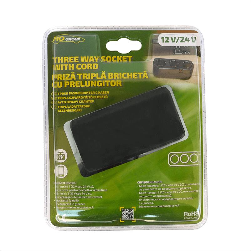 Priză brichetă triplă auto cu cablu RoGroup, alimentare 12/24V