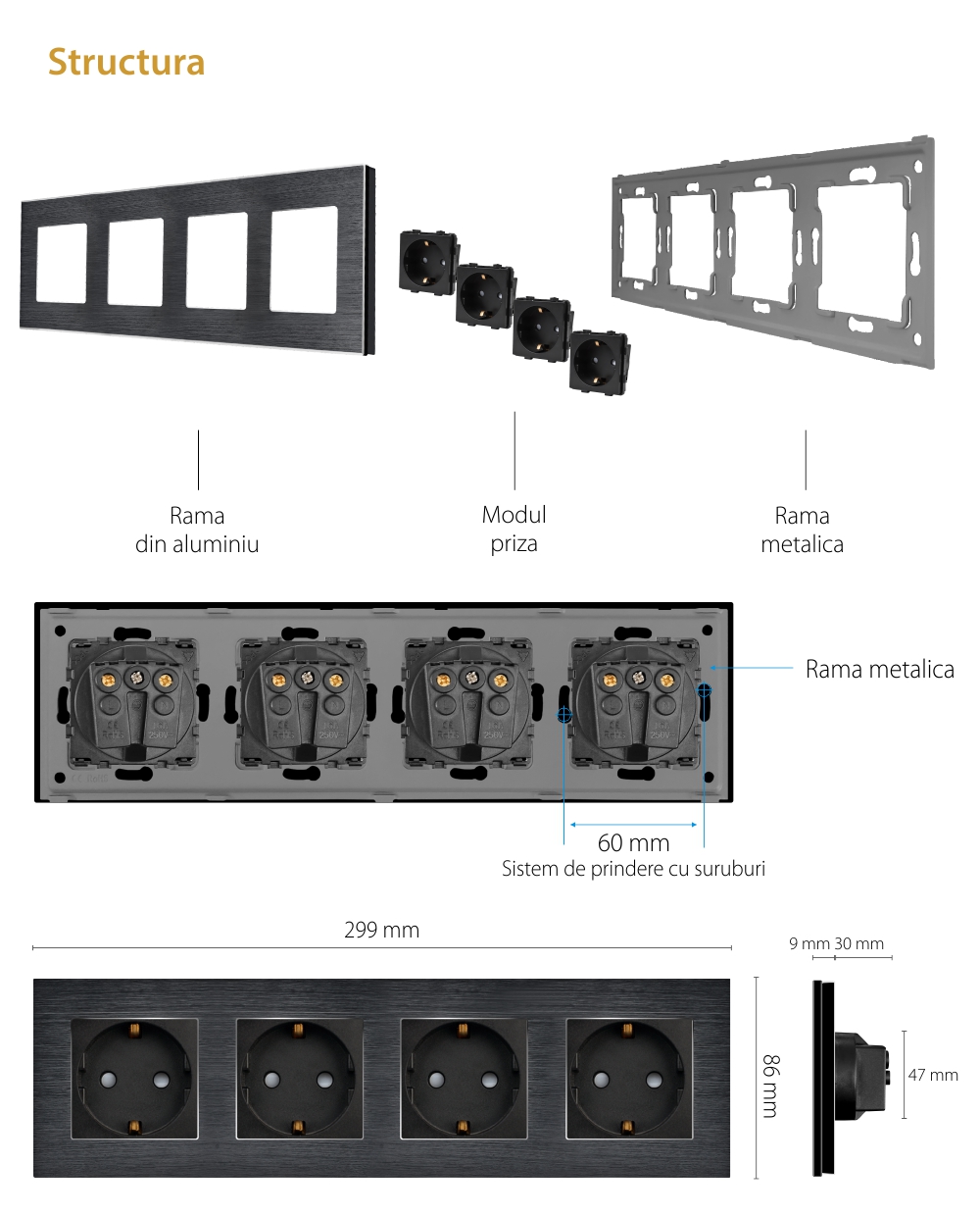Descriere Priza Cvadrupla LUXION rama aluminiu SmartElectro