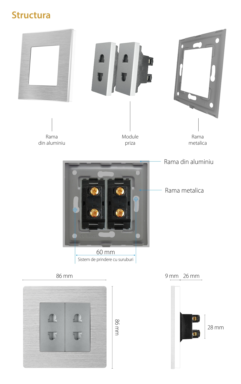 Specificatii Priza Dubla Module Inguste Rama Aluminiu
