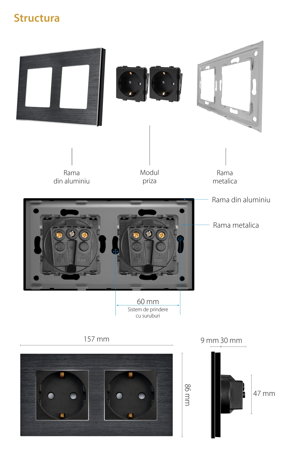 Specificatii Priza Dubla LUXION rama aluminiu SmartElectro