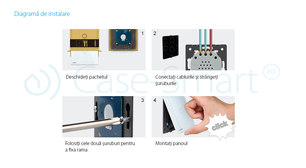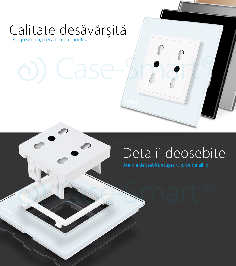 Priza dubla, de perete, cu rama din sticla, rezistenta la zgarieturi. Se monteaza facil cu ajutorul suruburilor pe care le gasesti in cutia produsului.
