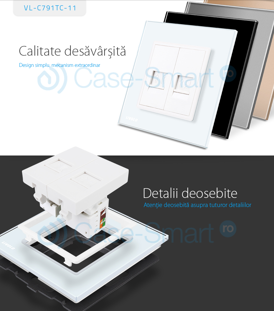 Priza dubla Telefon + Priza internet Livolo cu rama din sticla crystal, rezistenta la zgarieturi, umezeala, praf ofera casei tale un plus de rafinament si confort.
