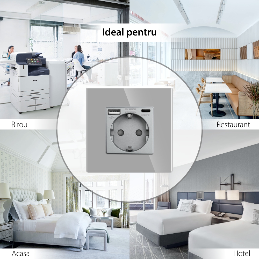 Priza simpla LUXION cu rama de sticla formata dintr-o priza simpla si 2 prize USB-A si USB-C. Prizele LUXION se diferentiaza prin design-ul compact, elegant si minimalist. Sunt versatile, dispun de protectie pentru copii, iar tehnologia de ultima generatie favorizeaza economisirea de energie. Structura este durabila, iar prizele nu se decoloreaza in timp. Este un produs practic, fabricat din materiale de calitate si rezistent in timp, ce ofera utilitate si confort casei tale. Atentie! Nu incape in doza normala! Trebuie doza dubla ca adancime Atentie! A nu se depasi capacitatea totala a prizei pentru buna functionare!