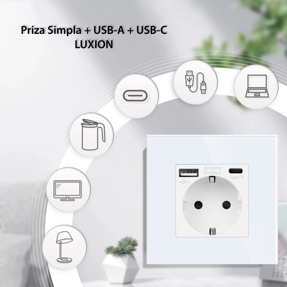 Priza Simpla + USB-A + USB-C LUXION cu Rama din Sticla SmartElectro IntelligentHouse