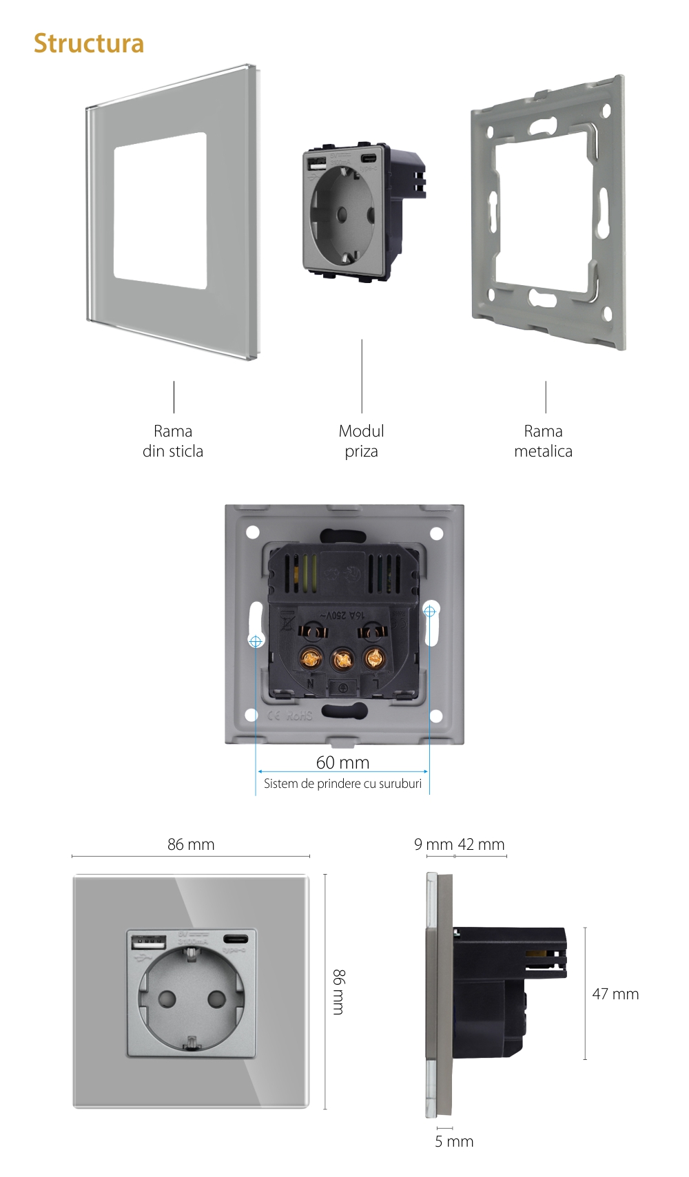 Priza Simpla + USB-A + USB-C LUXION cu Rama din Sticla SmartElectro IntelligentHouse