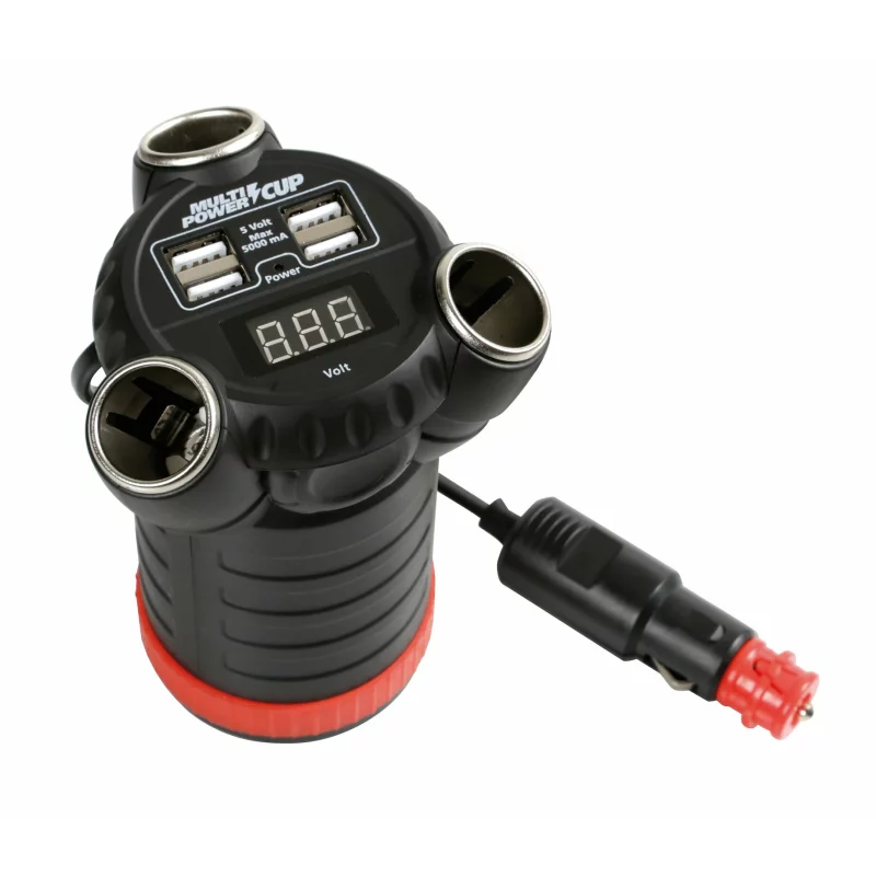 Priza triplă brichetă auto Multi Power Cup 3 în 1 este soluția practică pentru alimentarea simultană a mai multor dispozitive în mașină, camion sau barcă. Designul compact se potrivește în suportul pentru pahar, iar cele 3 ieșiri brichetă, cele 4 porturi USB și voltmetrul digital îți oferă control și confort la fiecare drum.