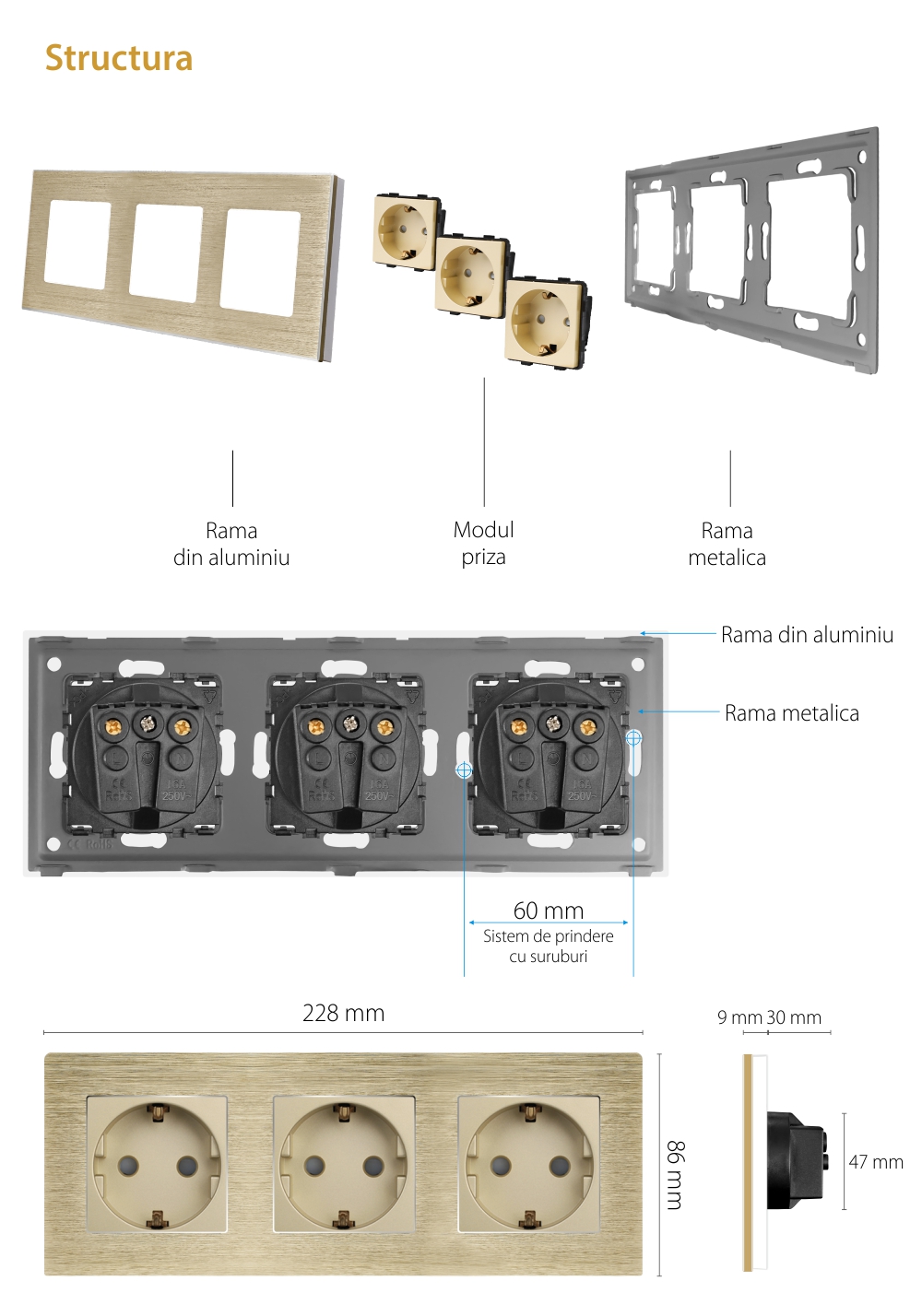 Specificatii Priza Tripla LUXION rama aluminiu SmartElectro