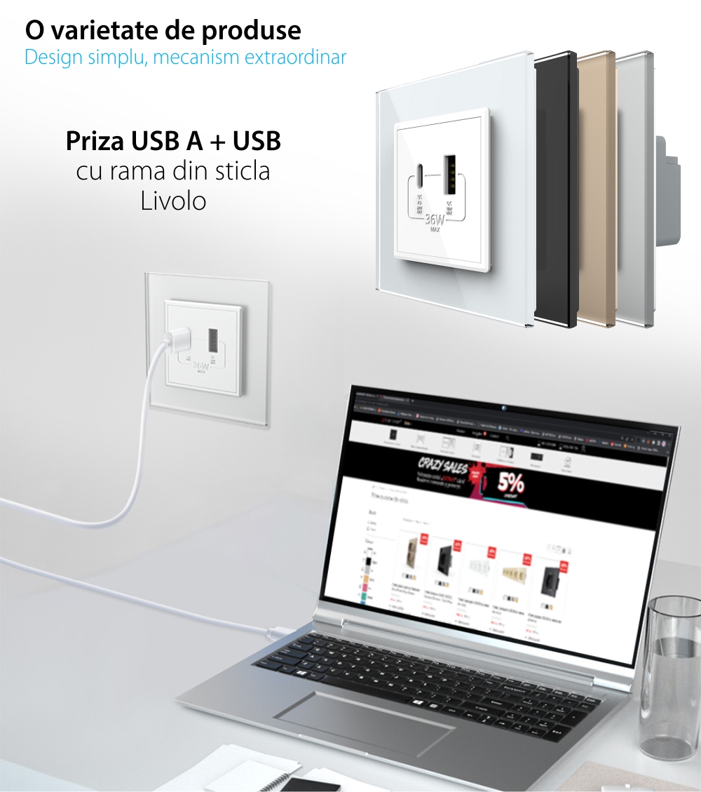 Priza USB-A + USB-C cu Rama Din Sticla LIVOLO - Serie Noua SmartElectro IntelligentHouse