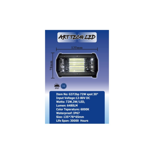 Îmbunătățește vizibilitatea în teren cu acest proiector LED 72W tip spot 30°, proiectat pentru lumină concentrată pe distanță. Cu 5000 lumeni și 6000K (alb rece), este o alegere potrivită pentru off-road, utilaje și aplicații în afara drumurilor publice, unde ai nevoie de iluminare puternică și precisă.