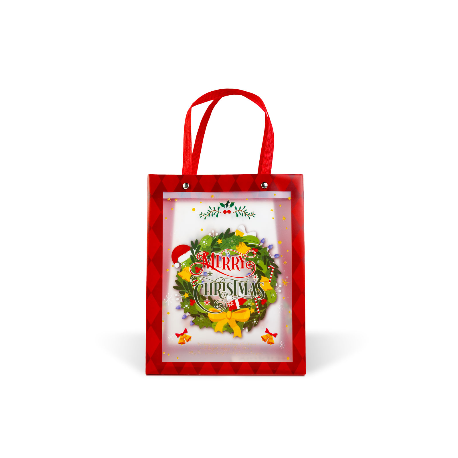 Disponibilă în două modele festive – cu rulotă sau cu coroniță decorativă –, punga are o nuanță bordo elegantă și un design translucid care îi oferă un aspect rafinat și modern. Mânerele metalice, fixate cu nituri, asigură o prindere sigură și o utilizare îndelungată.