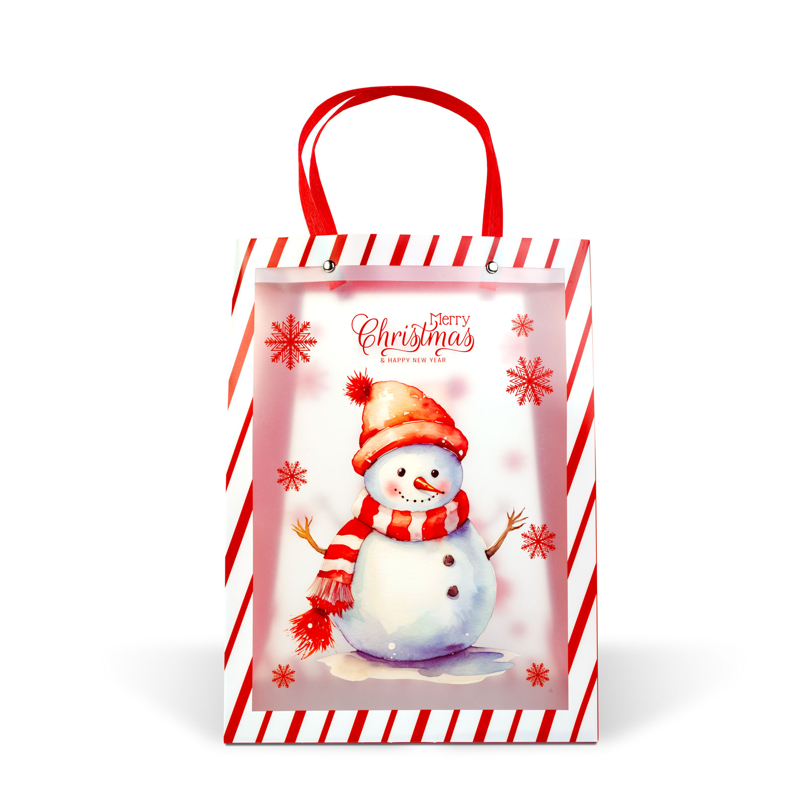 Disponibilă în două modele festive – unul cu rulotă decorată și altul cu om de zăpadă –, punga are o nuanță bordo rafinată și un design translucid ce adaugă un plus de stil oricărui cadou. Mânerele metalice, fixate cu nituri, asigură durabilitate și confort la transport.