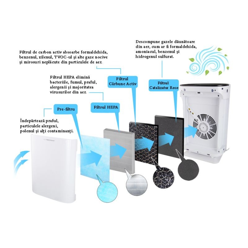 - 4 filtre incorporate: pre-filtru + filtru HEPA de inalta eficienta + filtru carbon activ + filtru de catalizator rece;
