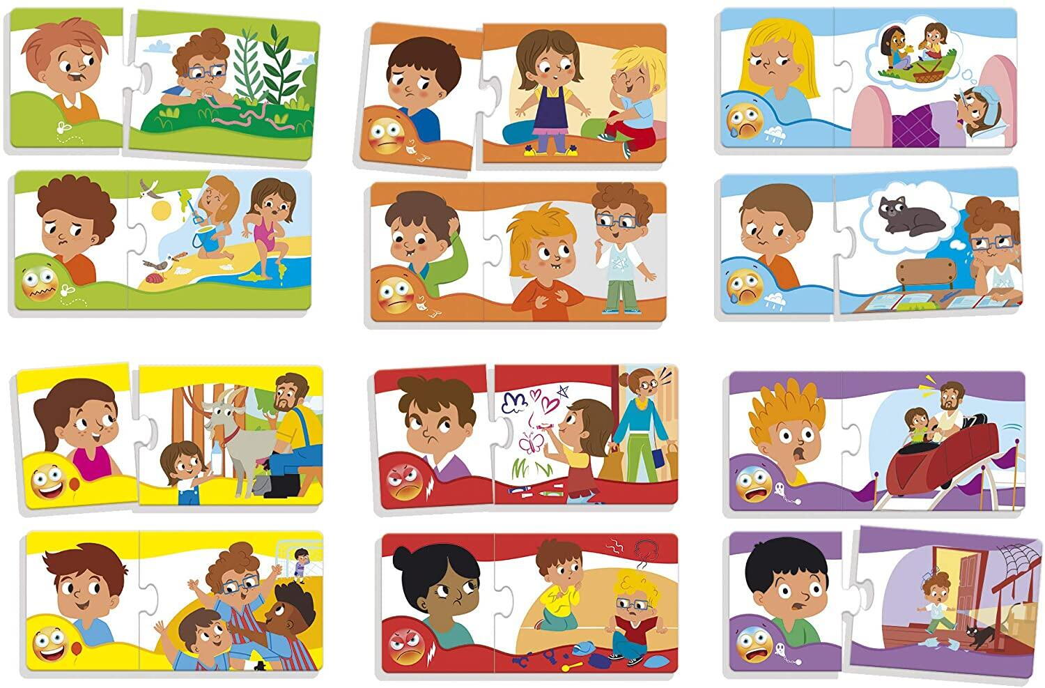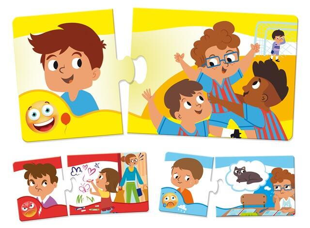 Mod de utilizare: Copilul potrivește cele 2 piese care formează fiecare scenă, asociind expresia personajului cu contextul ilustrat. Părintele poate numi emoția reprezentată și poate discuta cu cel mic despre situații similare din viața de zi cu zi.