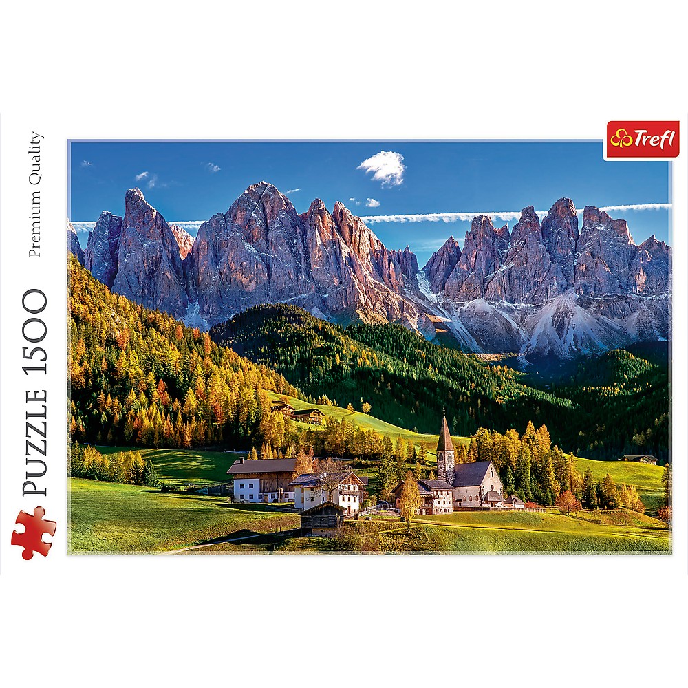 Descoperă un puzzle Trefl 1500 piese cu un decor spectaculos inspirat de Munții Dolomiți, perfect pentru momente de relaxare și concentrare. Imaginea panoramică, cu vârfuri stâncoase, păduri aurii și un sat pitoresc, transformă fiecare sesiune de asamblare într-o experiență plăcută și captivantă.