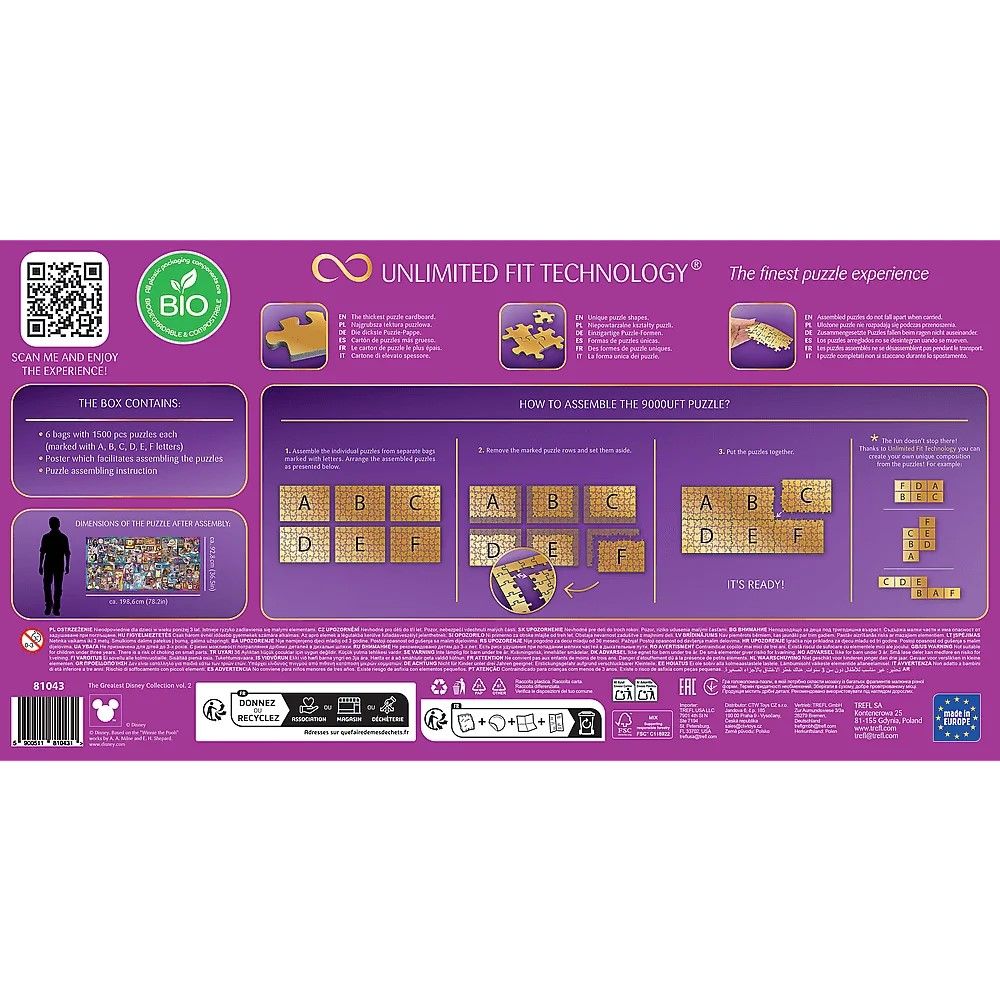 Descopera un puzzle Trefl Prime UFT 9000 piese spectaculos, inspirat din universul Disney, perfect pentru pasionatii de provocari creative si momente de relaxare in familie. Acest set impresionant reuneste 6 puzzle-uri a cate 1500 de piese, care pot fi combinate intr-o compozitie gigantica sau aranjate liber, datorita tehnologiei UFT. Este alegerea ideala pentru dezvoltarea rabdarii, concentrarii si indemanarii.