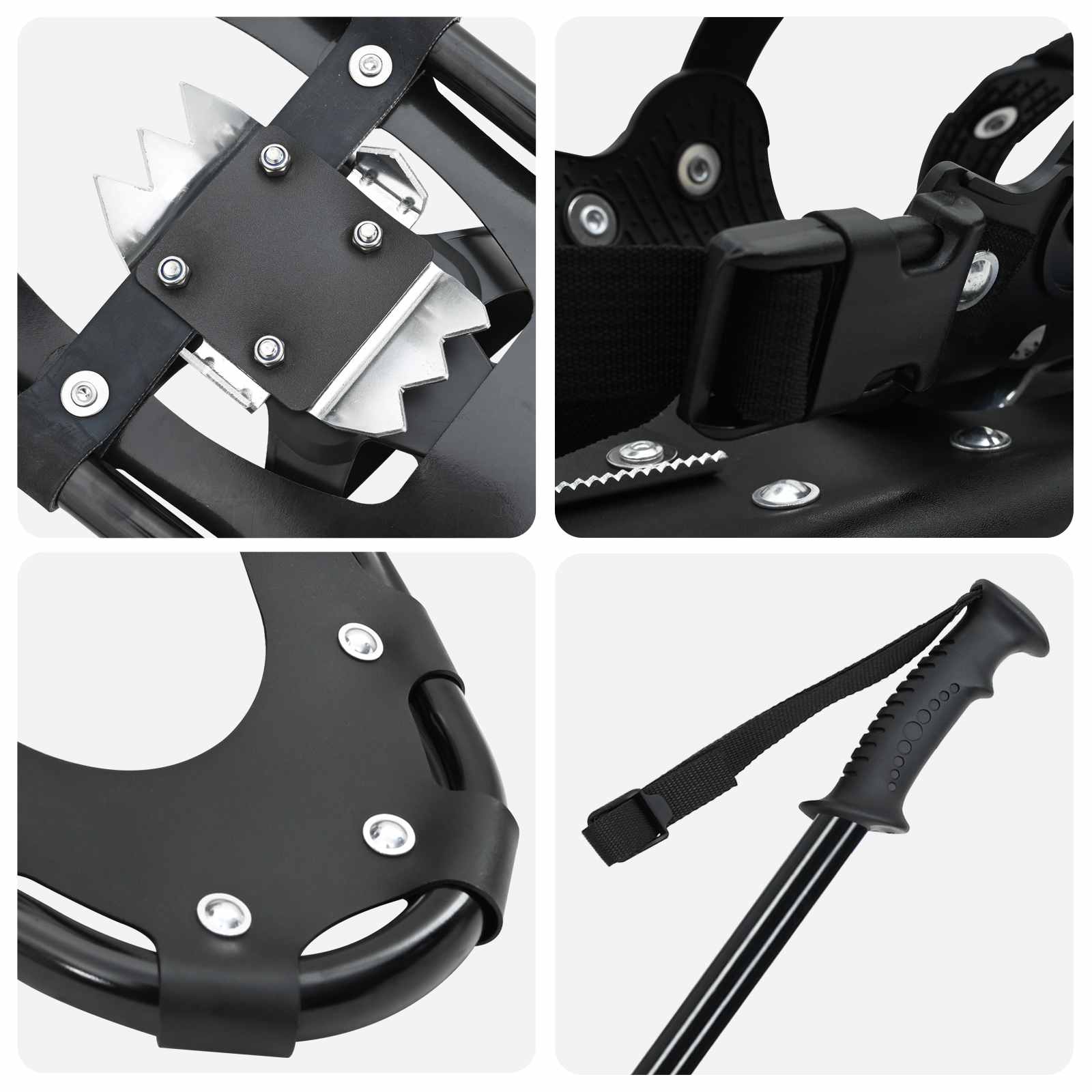 - Set complet: Pachetul conține o pereche de snowshoe-uri, două bețe de drumeție ajustabile și o geantă de transport, perfect pentru cine vrea un kit complet de trekking pe zăpadă. Fiecare componentă e gândită pentru transport ușor și depozitare, asigurând că ești tot timpul pregătit pentru aventuri.