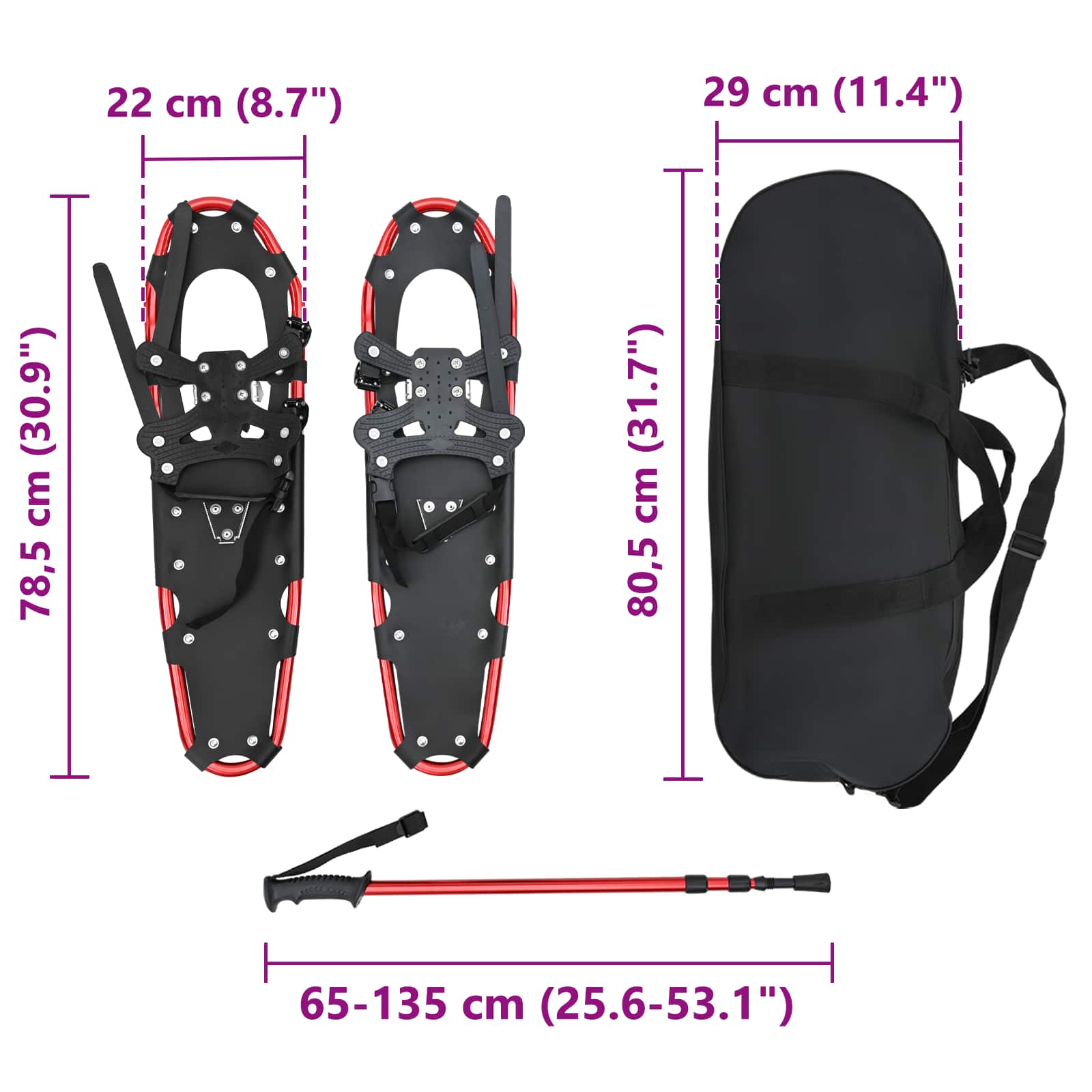 - Set complet: Pachetul conține o pereche de snowshoe-uri, două bețe de drumeție ajustabile și o geantă de transport, perfect pentru cine vrea un kit complet de trekking pe zăpadă. Fiecare componentă e gândită pentru transport ușor și depozitare, asigurând că ești tot timpul pregătit pentru aventuri.