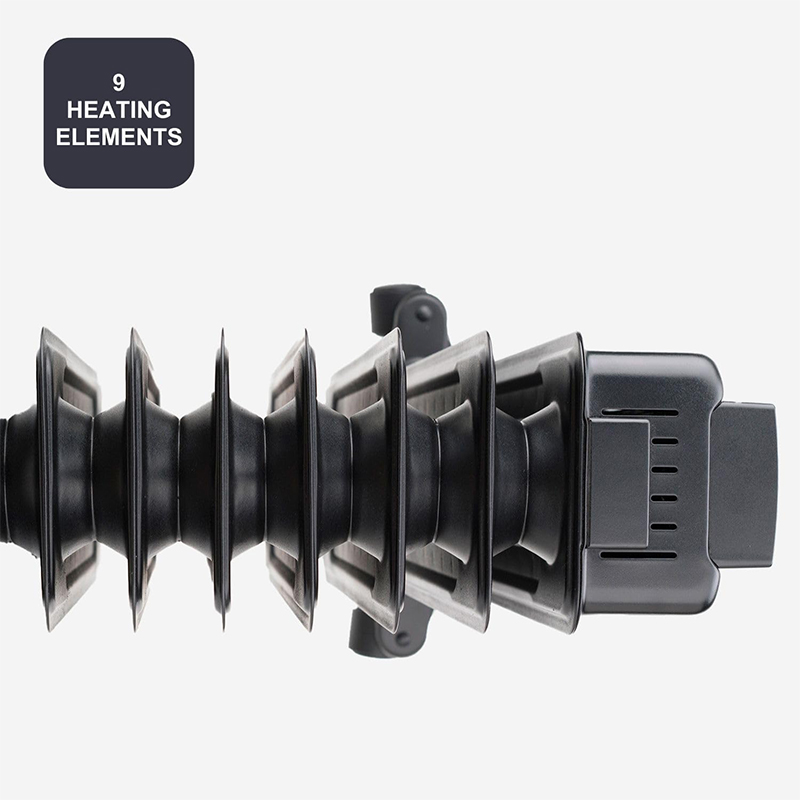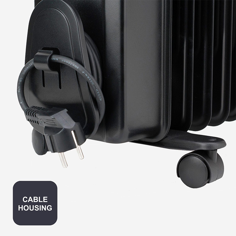Proiectat pentru a se incadra perfect in orice decor, caloriferul electric a fost realizat din metal finisat cu vopsea neagra, rezistenta la temperaturile inalte. Cu un design elegant, caloriferul electric este portabil, astfel incat il puteti transporta cu usurinta in orice incapere, datorita rotilor sale multidirectionale si a manerului ergonomic, pentru o manevrare usoara. De asemenea, puteti economisi spatiul de depozitare cu ajutorul sistemului de stocare a cablului, incorporat.