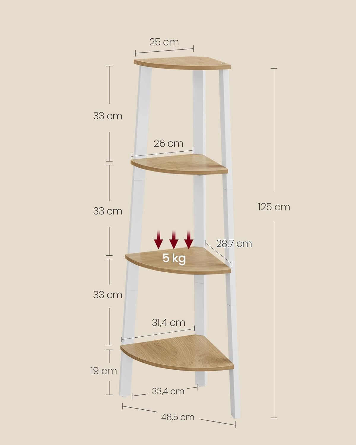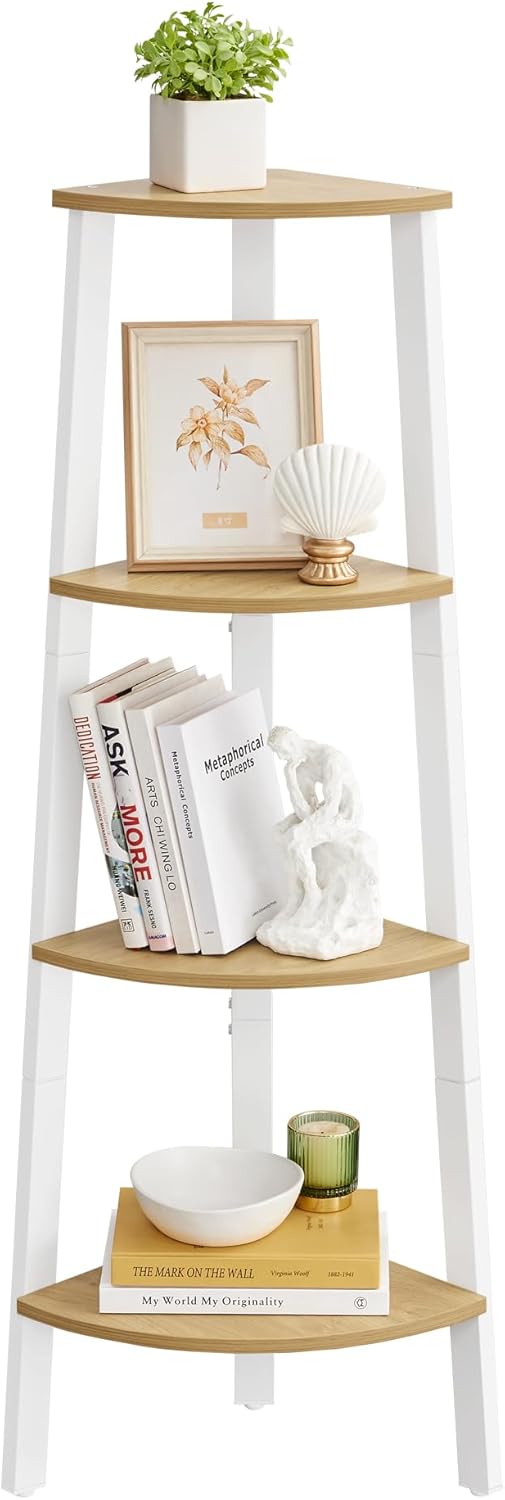 Valorifica inteligent fiecare colt al casei cu acest raft de colt cu 4 etaje VASAGLE, ideal pentru living, dormitor, hol sau birou. Designul sau compact combina politele cu aspect de lemn in nuanta maro natural cu un cadru metalic alb, pentru un efect modern si aerisit. Este o alegere practica pentru cei care isi doresc depozitare pe colt, dar si un accent decorativ elegant.