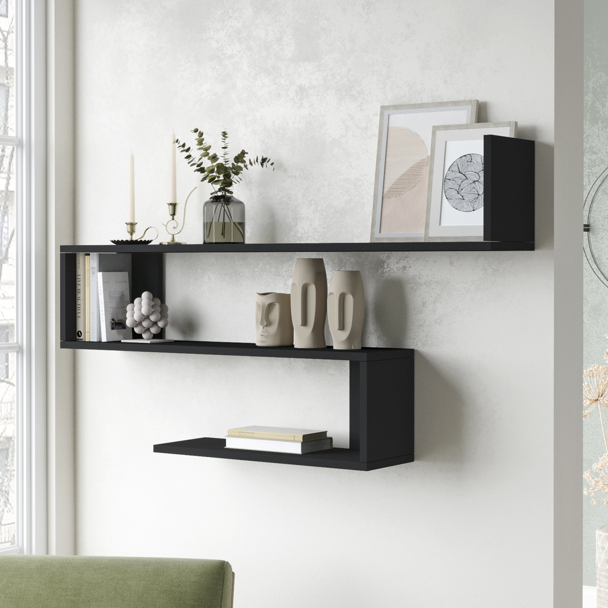 Raft de perete Kitee este o alegere inspirata pentru amenajarea unui spatiu modern si bine organizat. Cu un aspect elegant, linii simple si finisaj negru versatil, acest raft de perete negru adauga un plus de stil in living, dormitor, hol sau birou. Cele 3 polite ofera suficient loc pentru carti, decoratiuni, rame foto sau obiecte de uz zilnic.