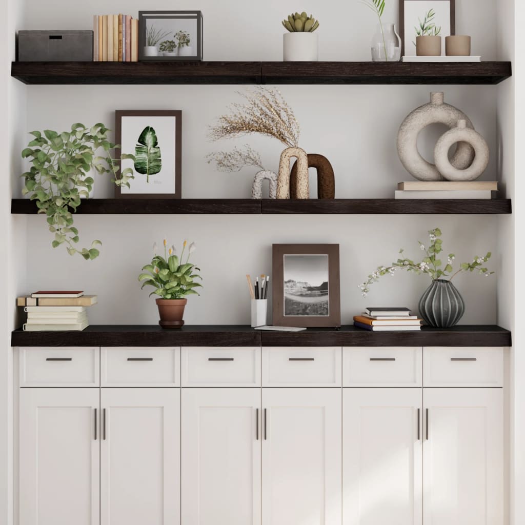 - Suprafață tratată: Raftul din lemn a fost tratat cu vopsea de culoare închisă, astfel încât este gata de utilizare, deoarece nu este necesar un finisaj suplimentar.