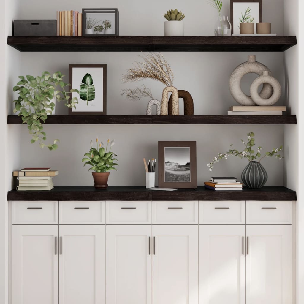 - Suprafață tratată: Raftul din lemn a fost tratat cu vopsea de culoare închisă, astfel încât este gata de utilizare, deoarece nu este necesar un finisaj suplimentar.