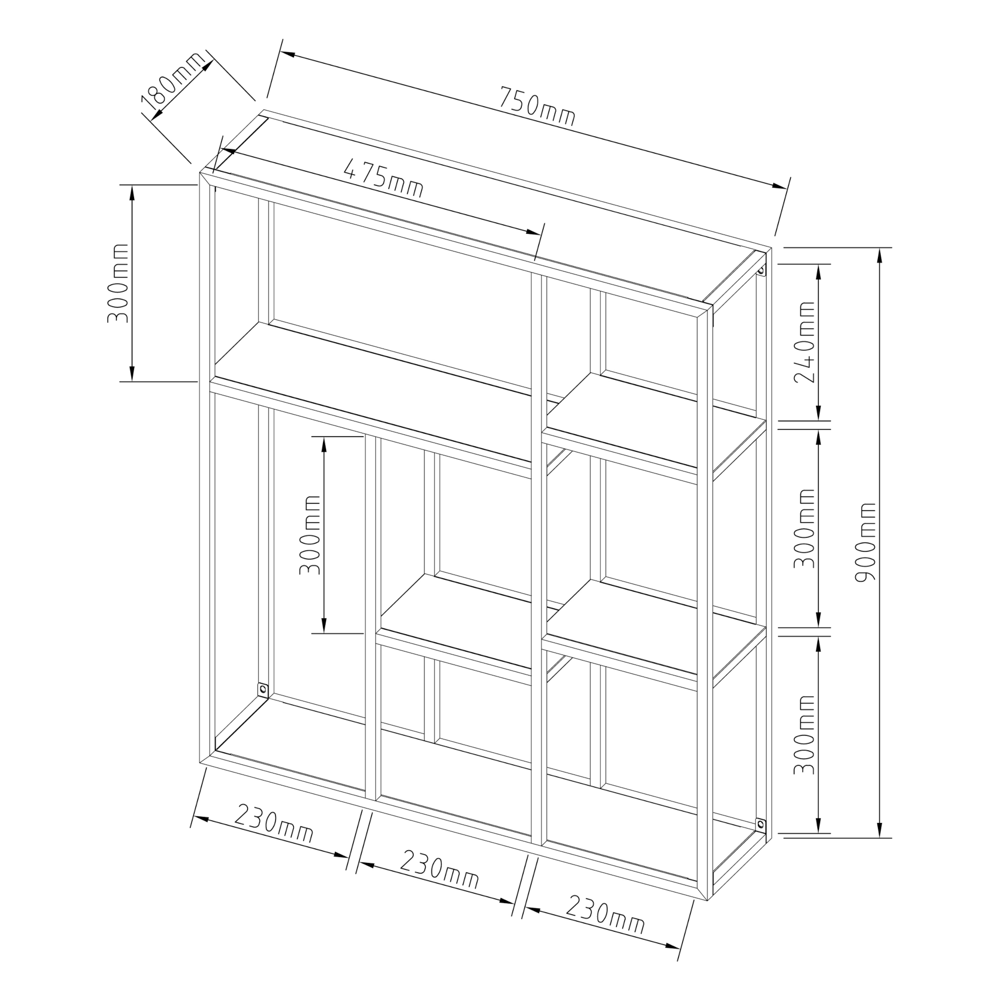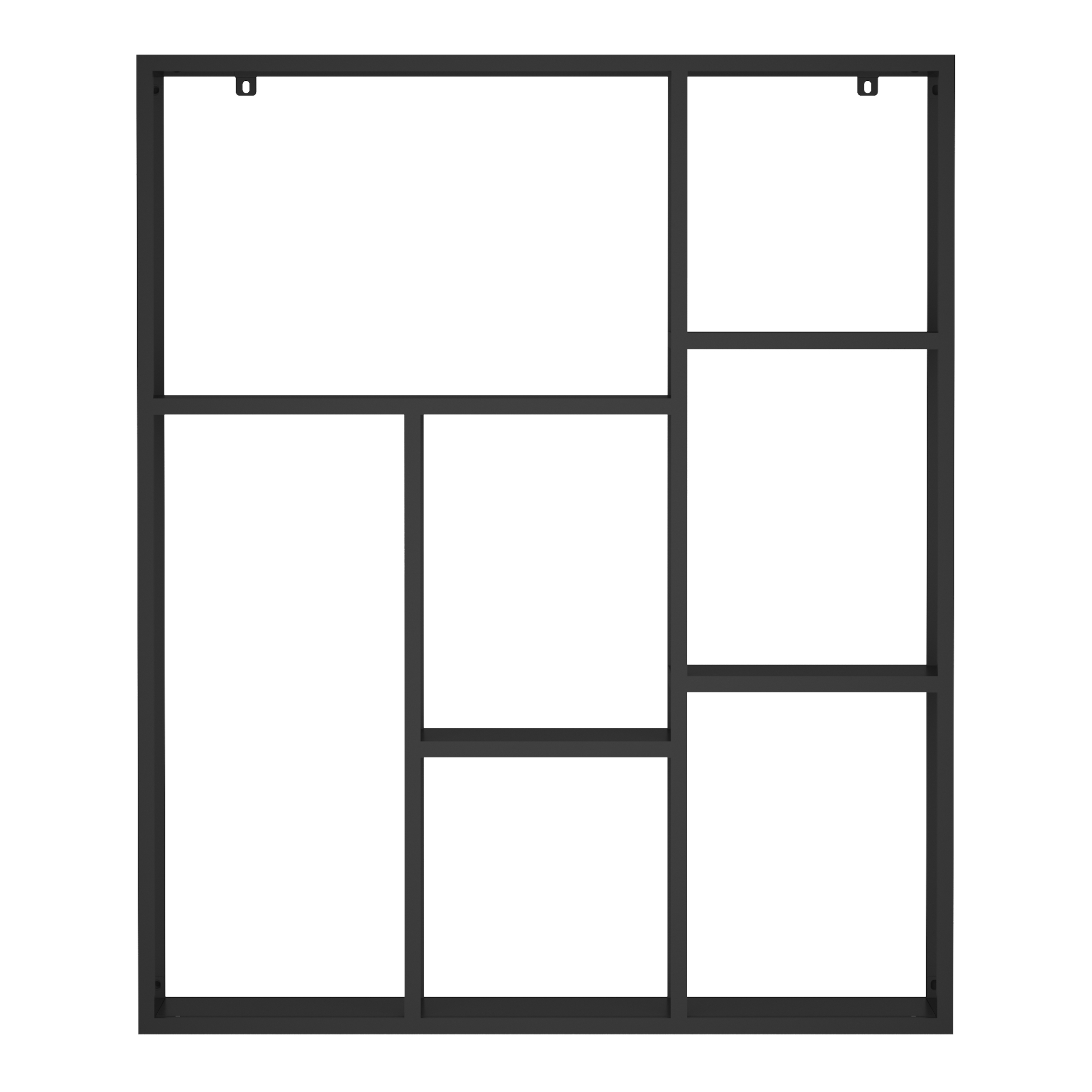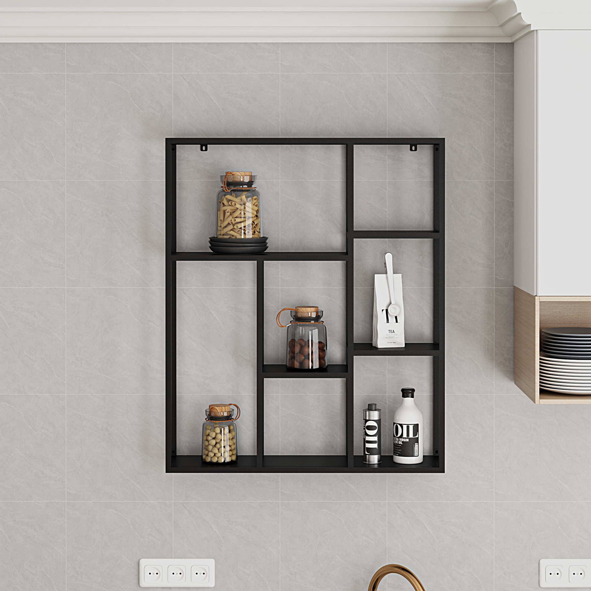 Prevazut cu 7 compartimente deschise, raftul ofera suficient spatiu pentru decoratiuni, carti, suveniruri, recipiente, condimente sau ustensile de uz zilnic. Structura sa din otel contribuie la stabilitate si rezistenta, iar montajul pe perete se realizeaza rapid cu ajutorul accesoriilor incluse.