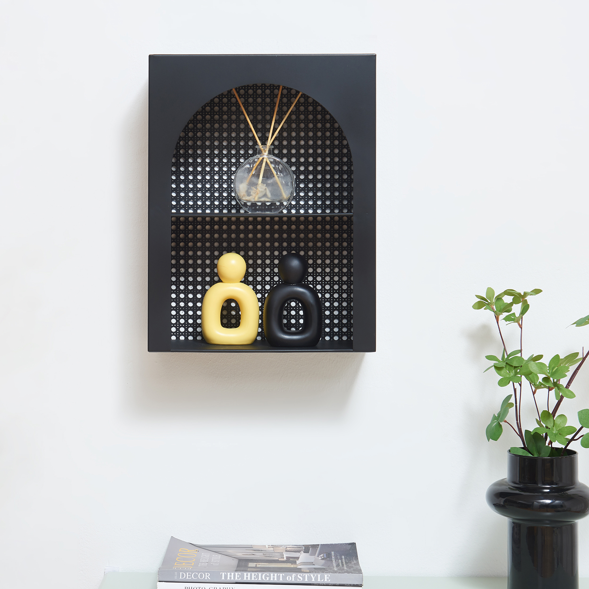 Prevăzut cu două compartimente practice, raftul te ajută să expui frumos obiecte decorative, parfumuri, cărți, plante mici sau accesorii de zi cu zi. Forma sa compactă îl face perfect pentru spații mai mici, oferind în același timp un plus de depozitare fără să încarce vizual încăperea.