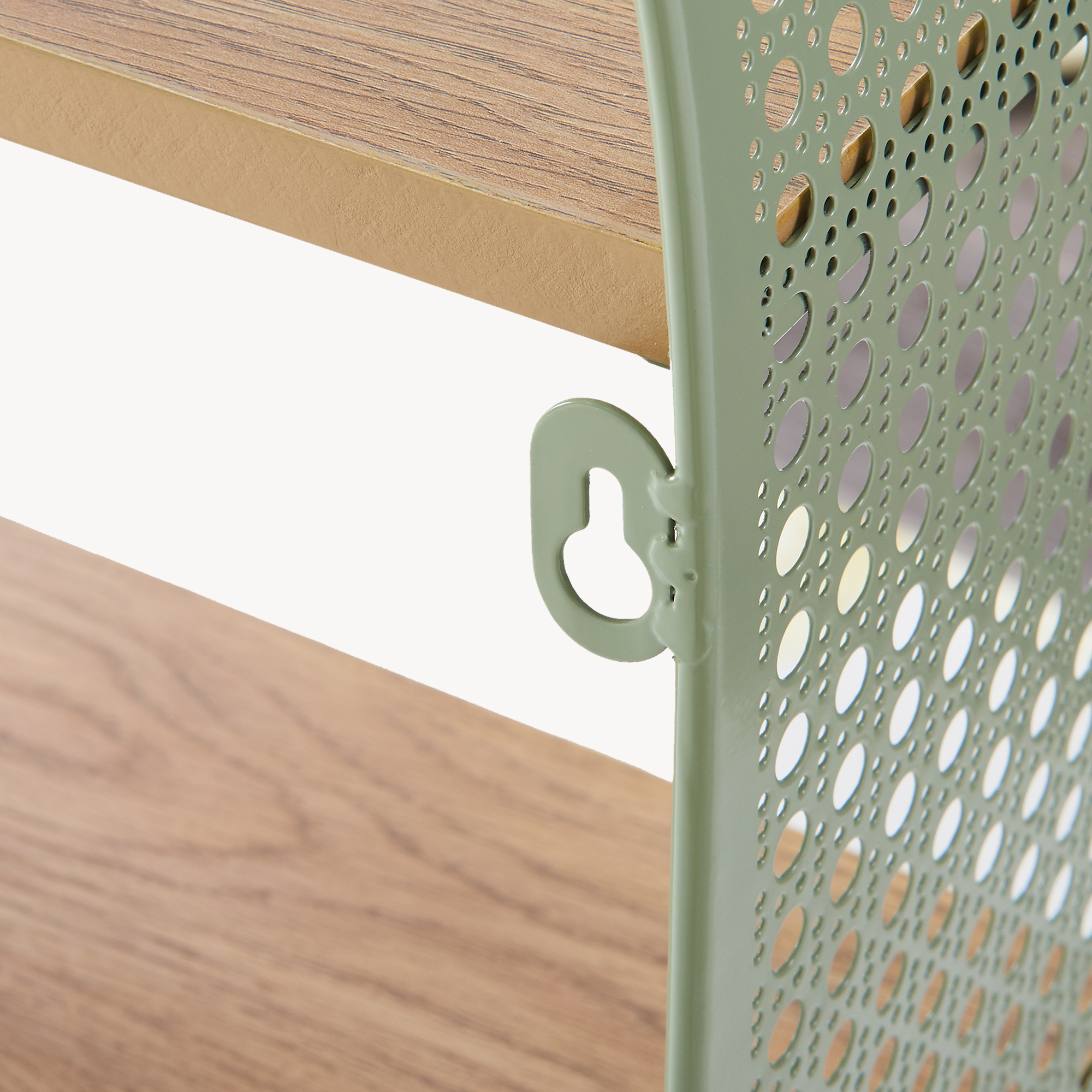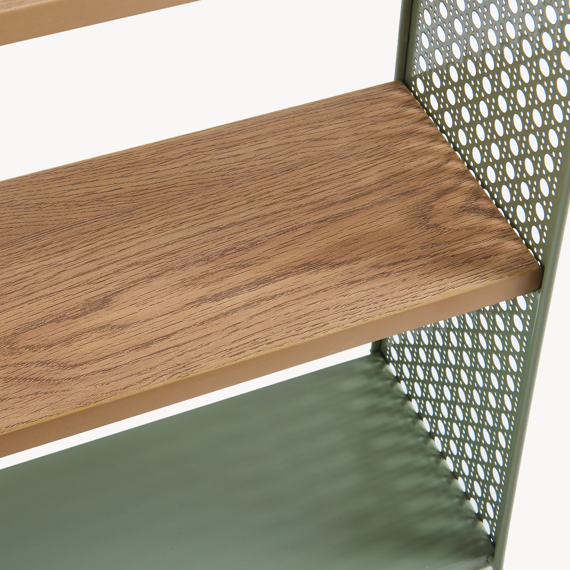 Modelul este ușor de integrat în amenajări moderne, scandinave sau boho, iar combinația dintre metalul verde și polițele în nuanță de lemn creează un aspect cald și prietenos. În plus, se întreține simplu, cu o lavetă umedă, iar montajul pe perete se face rapid, datorită accesoriilor incluse.