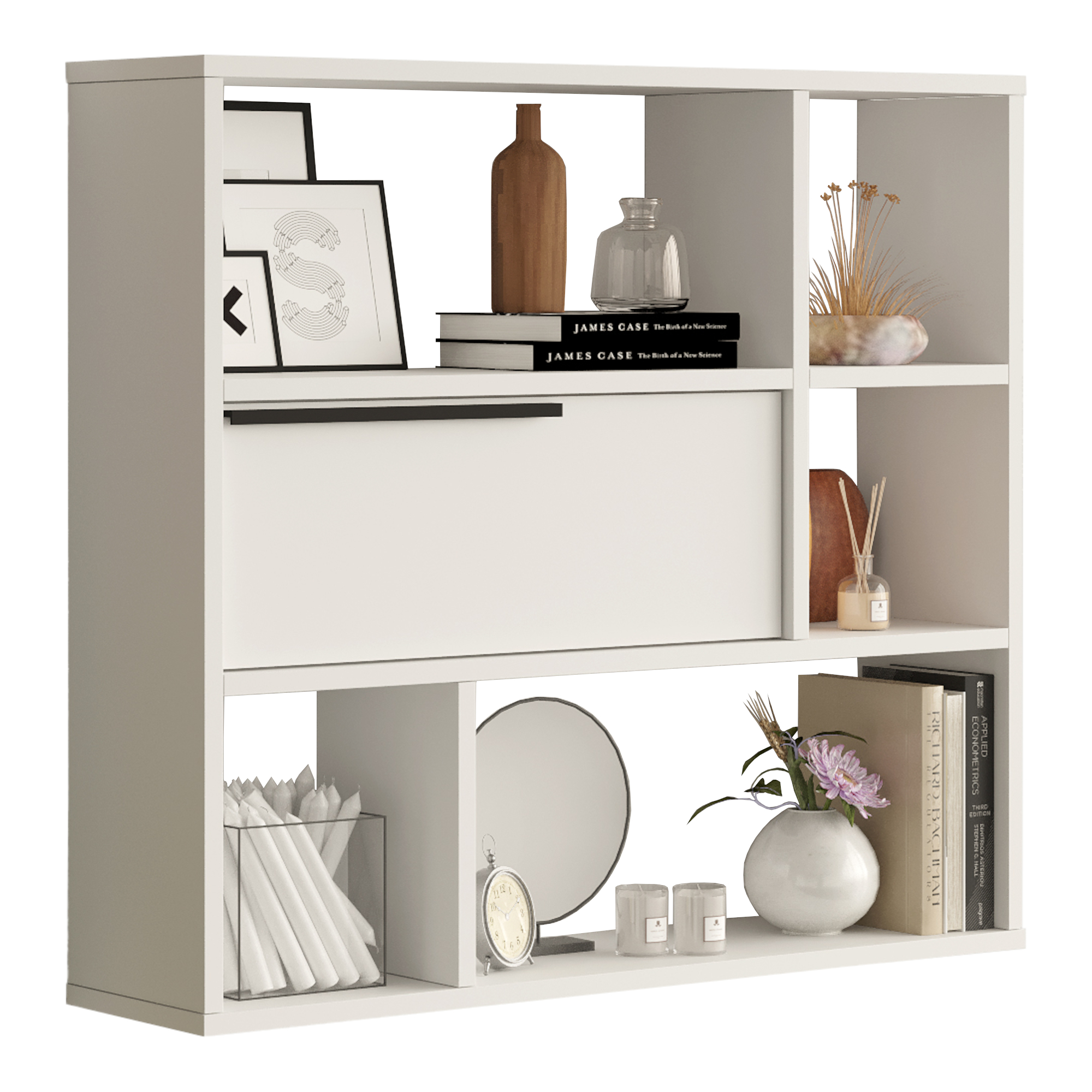 Prevăzut cu 5 compartimente deschise, raftul oferă spațiu generos pentru cărți, decorațiuni, plante sau obiecte de zi cu zi, păstrând totul la îndemână și frumos expus. În plus, compartimentul suplimentar cu deschidere rabatabilă este ideal pentru depozitarea obiectelor pe care doriți să le țineți mai discret organizate.