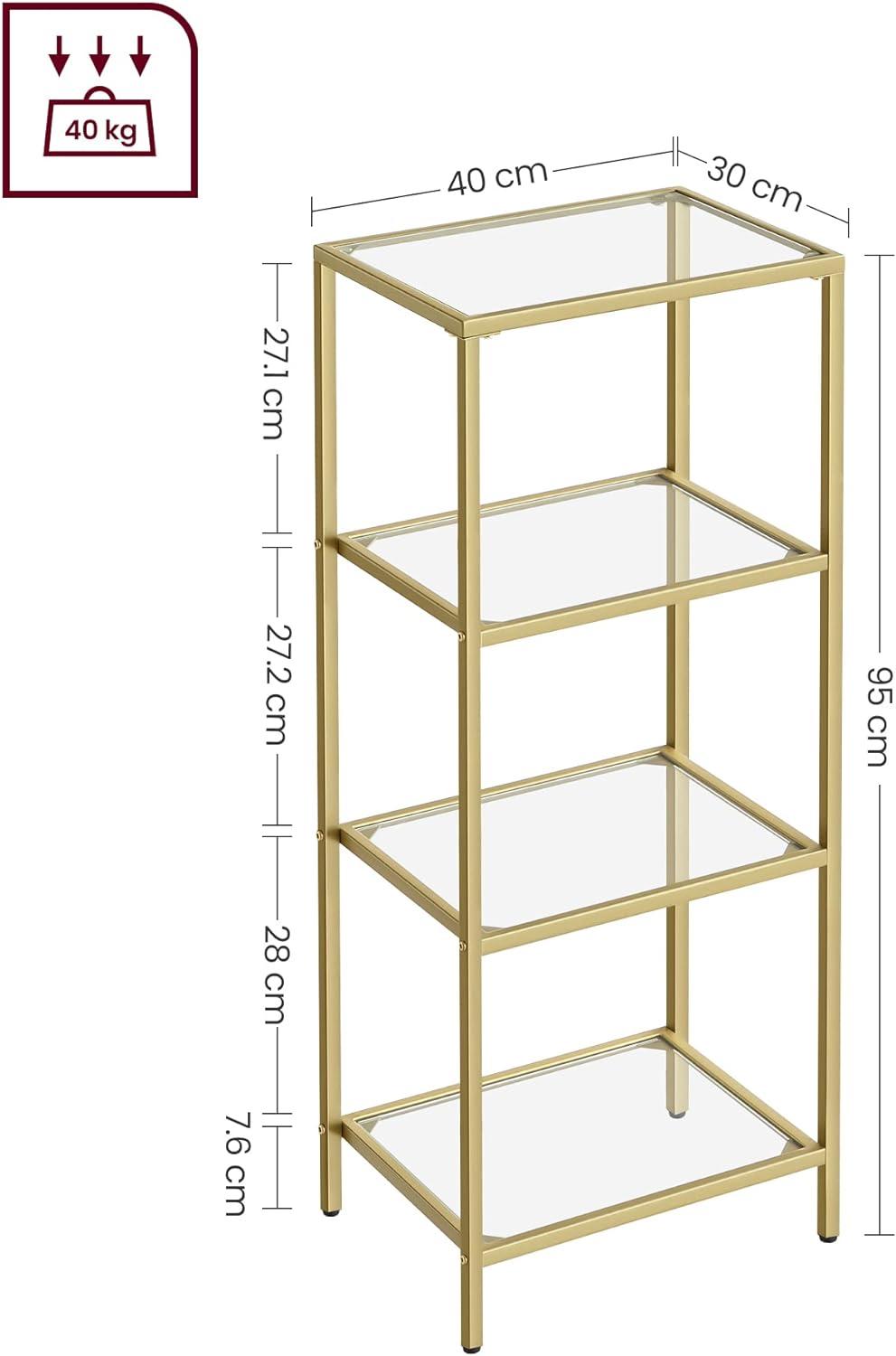 Alege un raft ingust VASAGLE cu design modern, perfect pentru organizare si decor in dormitor, living sau birou. Cele 4 polite din sticla securizata ofera un aspect elegant si aerisit, iar cadrul din otel cu finisaj auriu adauga un plus de stil oricarui spatiu. Este ideal pentru carti, plante, rame foto, parfumuri sau obiecte decorative.