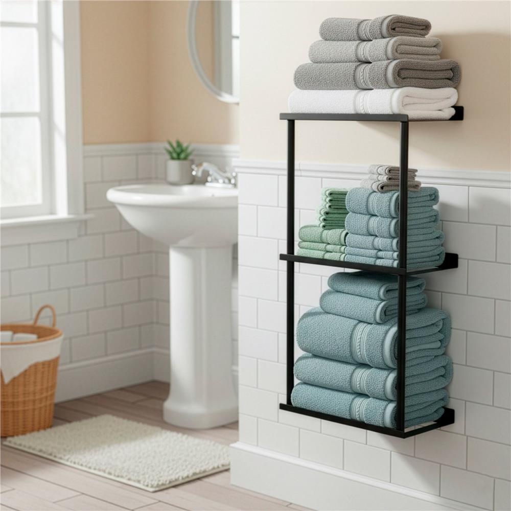 Organizează eficient spațiul din baie, bucătărie sau hol cu acest raft metalic pentru prosoape cu design modern și compact. Realizat din metal rezistent, cu finisaj mat elegant, raftul oferă un plus de ordine și un aspect discret, ușor de integrat în decoruri contemporane. Cele 3 niveluri sunt potrivite pentru depozitarea prosoapelor, cosmeticelor, accesoriilor de baie sau altor obiecte de uz zilnic.