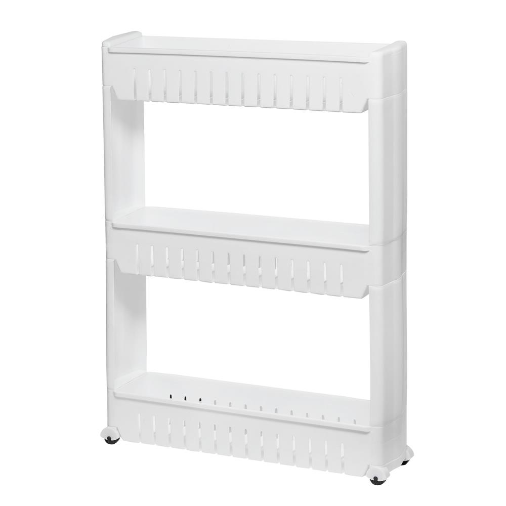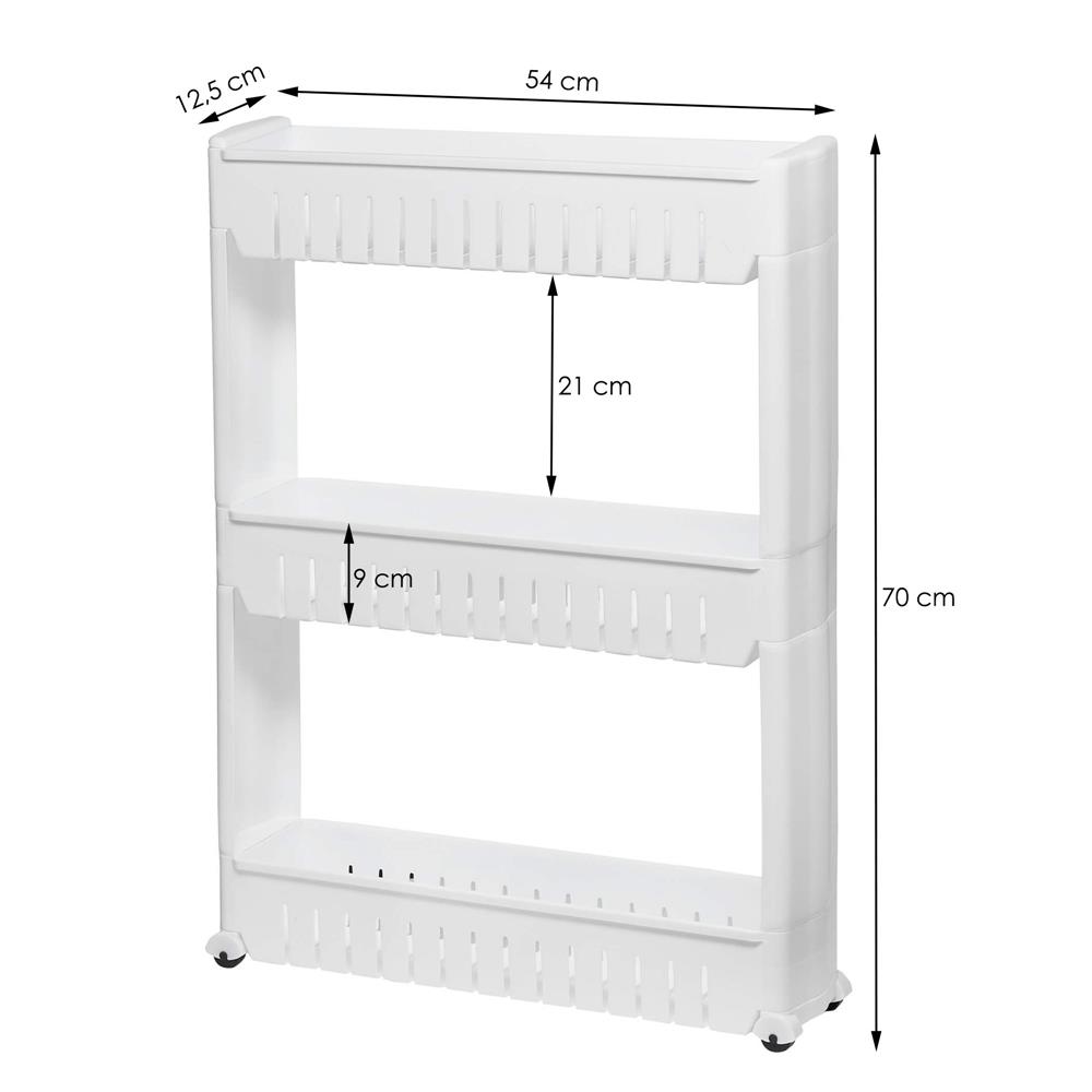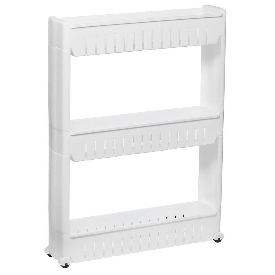 Raft mobil ingust Sersimo HA110 cu 3 polite si roti, alb, pentru baie si bucatarie