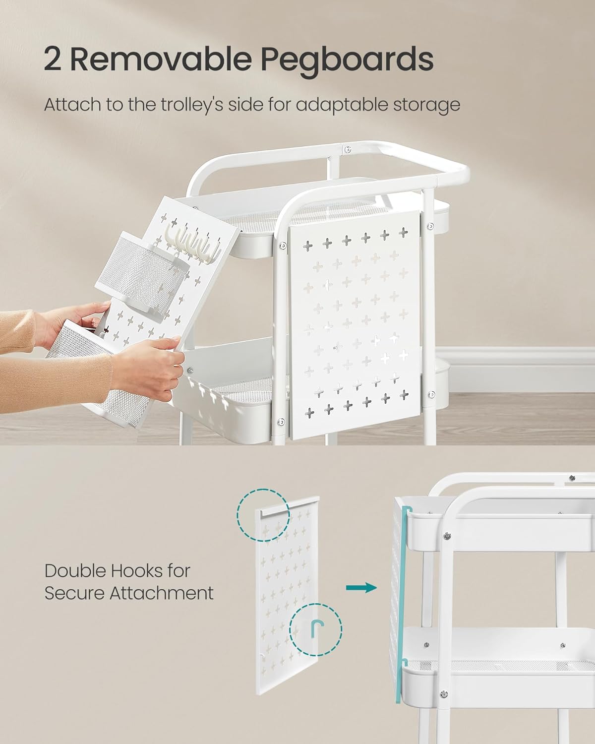 Este o alegere inspirata daca iti doresti un raft de depozitare cu roti care sa combine functionalitatea cu un aspect curat, modern, in finisaj alb. Accesoriile laterale detasabile si carligele repozitionabile iti permit sa adaptezi spatiul exact in functie de nevoile tale.