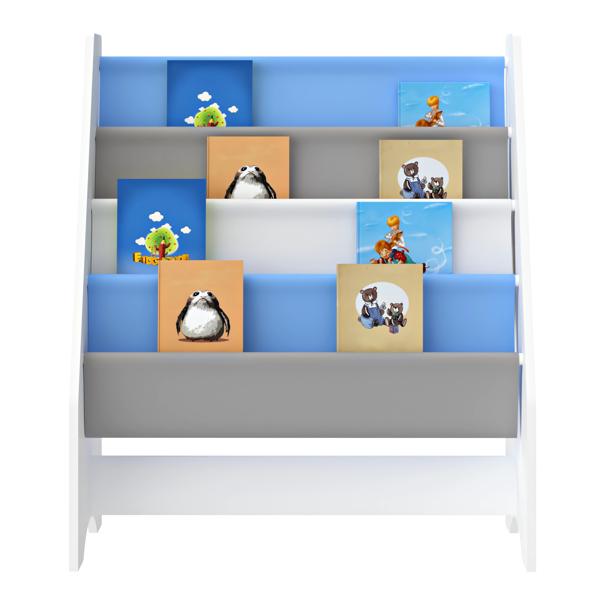 Raftul pentru cărți copii Fisterra este alegerea ideală pentru o cameră ordonată, practică și plină de farmec. Cu un design prietenos, în nuanțe de alb, gri și albastru, plus laterale decorative cu motiv Koala, acest raft copii oferă spațiu generos pentru depozitarea cărților, caietelor și revistelor preferate.