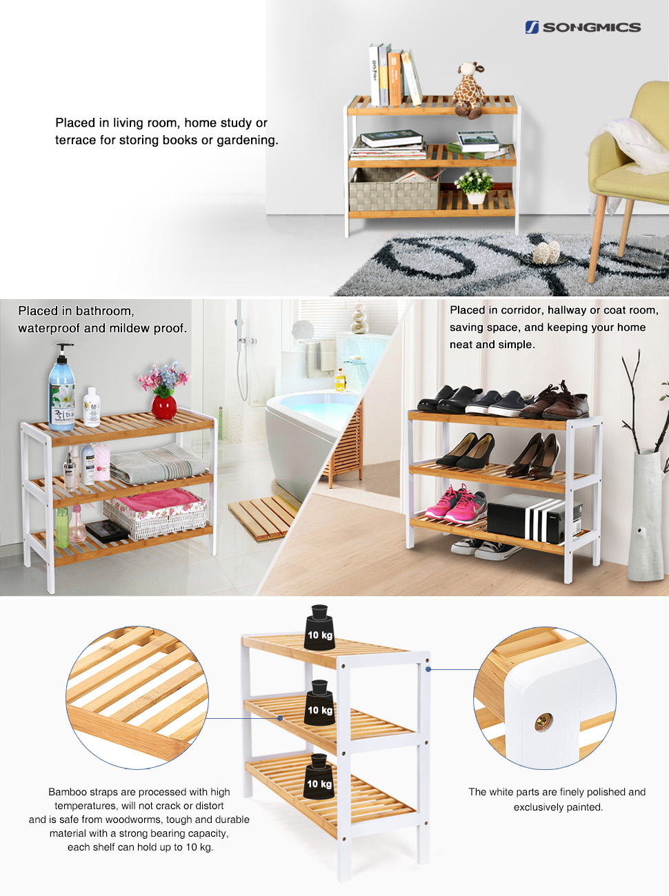 Raft pentru pantofi SONGMICS din bambus, 3 niveluri, alb si maro