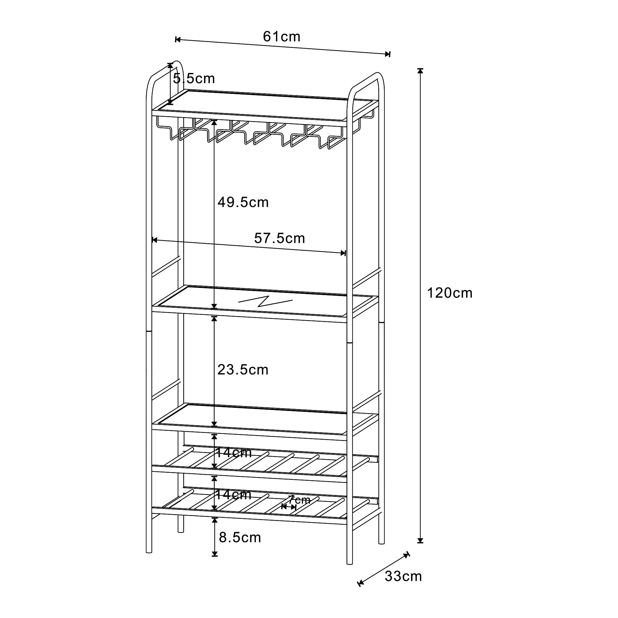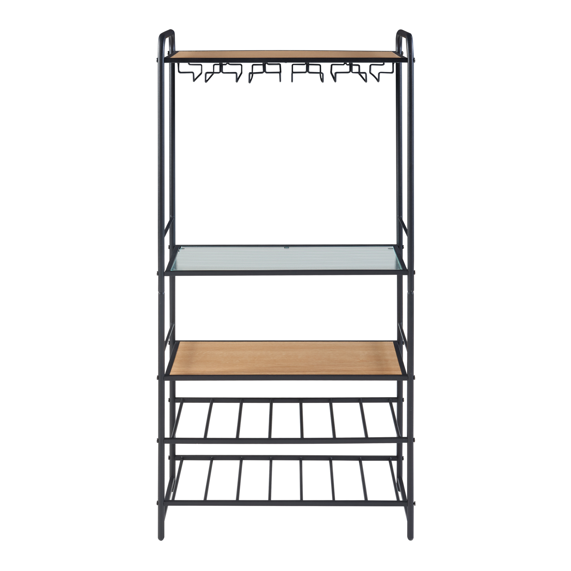 Dispune de 3 polite generoase, dintre care una din sticla, ideale pentru pahare, accesorii sau obiecte decorative, precum si de 2 rafturi metalice speciale pentru sticle de vin, care asigura depozitare stabila si acces facil. In partea superioara este integrat un suport pentru pahare, foarte practic pentru servire rapida si organizare eficienta.