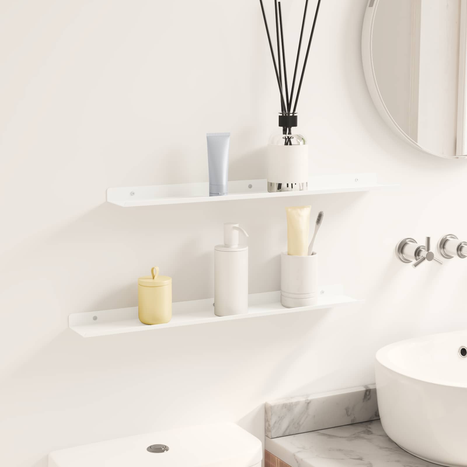 - Instalare simplă Raftul ăsta e conceput să se monteze ușor pe perete cu unelte de bază. Șuruburile nu sunt incluse, așa că alege-le în funcție de peretele tău.