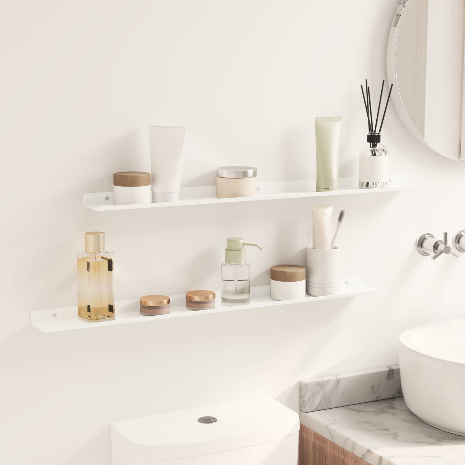 - Instalare simplă Raftul ăsta e conceput să se monteze ușor pe perete cu unelte de bază. Șuruburile nu sunt incluse, așa că alege-le în funcție de peretele tău.