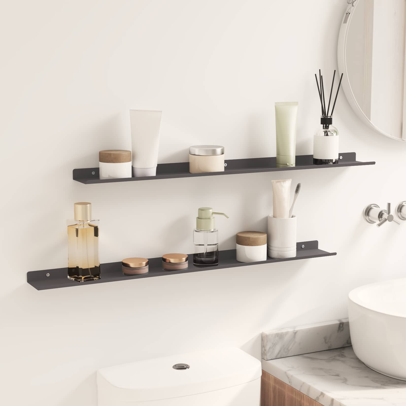 - Instalare simplă Raftul ăsta e conceput să se monteze ușor pe perete cu unelte de bază. Șuruburile nu sunt incluse, așa că alege-le în funcție de peretele tău.