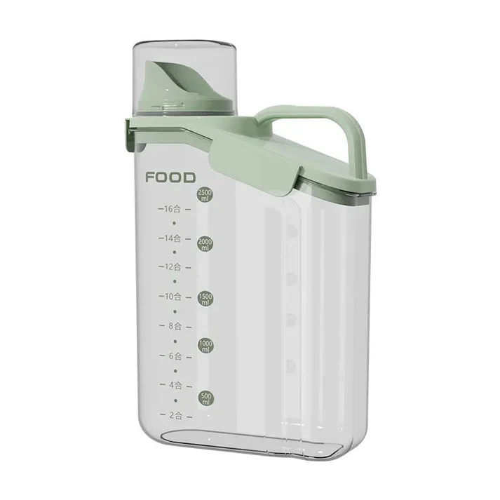 Utilizare: Umple recipientul cu orez, cereale, paste scurte, făină sau nuci. Închide capacul pentru o depozitare sigură, apoi toarnă direct în vas folosind gura dozatoare. Folosește paharul măsurător pentru porționare.