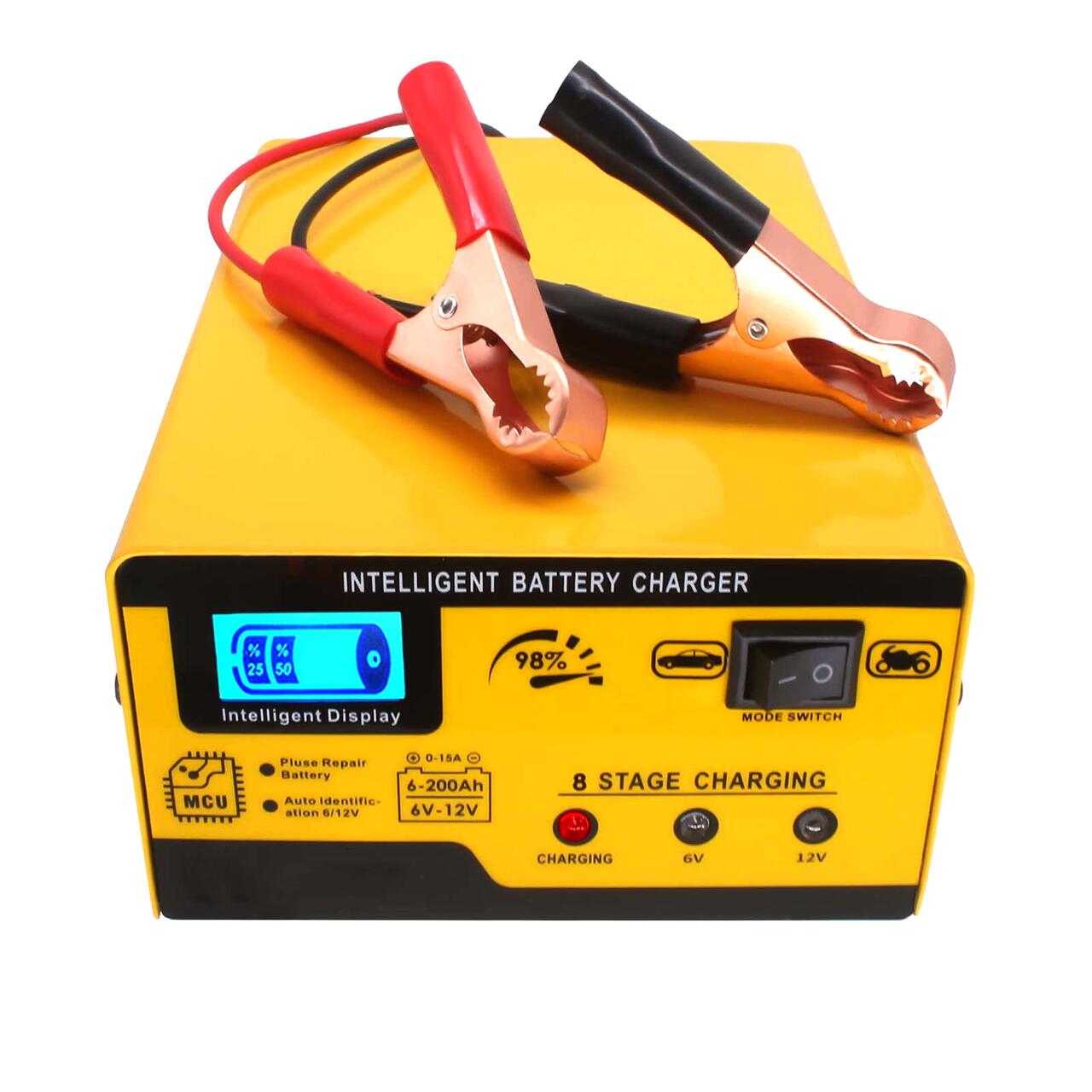 Avand un curent de incarcare cuprins intre 0-15A gestionat automat, se foloseste pentru baterii auto cu un amperaj cuprins intre 6-200A.