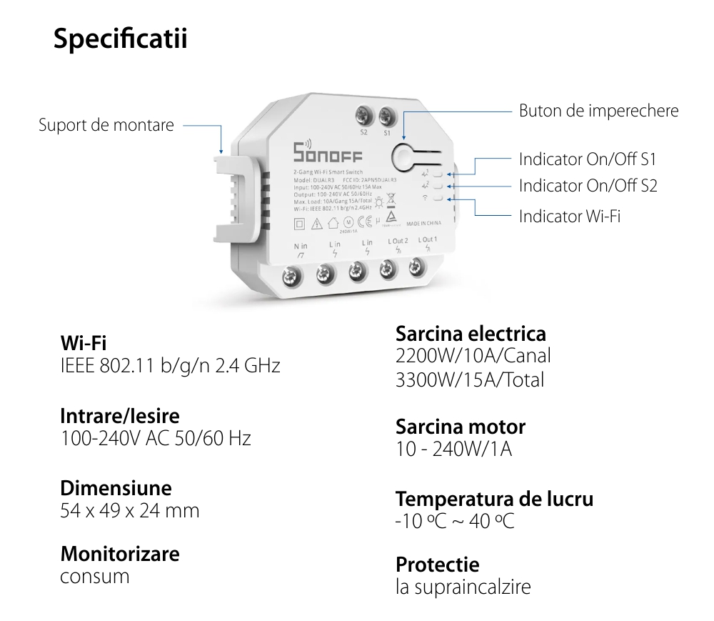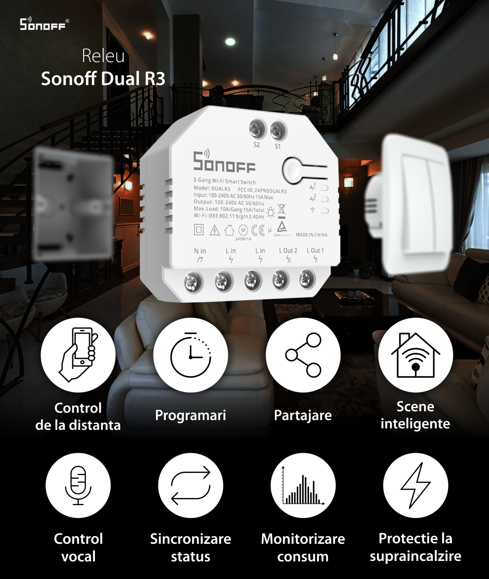 Releu Sonoff Dual R3 cu 2 canale, Programari, Wi-Fi 2.4 GHz, Contor energie SmartElectro IntelligentHouse