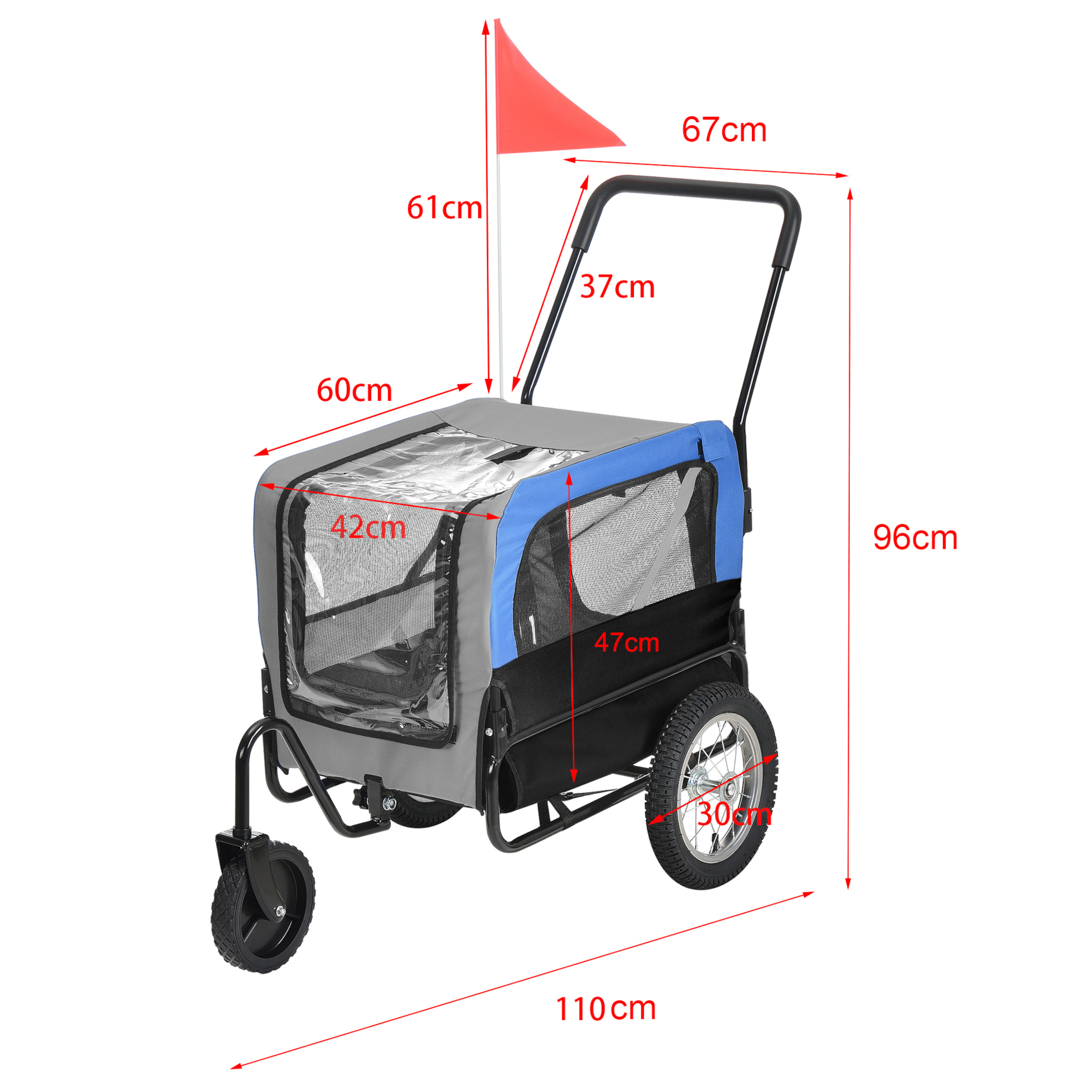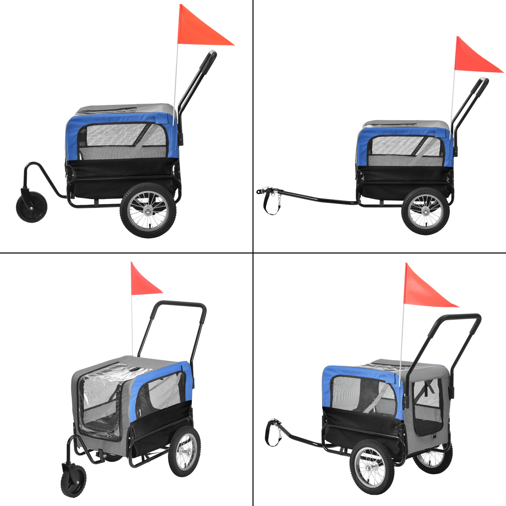Montezi cuplajul inclus pentru a o atașa la bicicletă sau fixezi roata frontală pentru a transforma rapid remorca într-un jogger ușor de împins. Este potrivită pentru plimbări zilnice, excursii, deplasări în parc sau transport confortabil pentru câinii care obosesc repede.