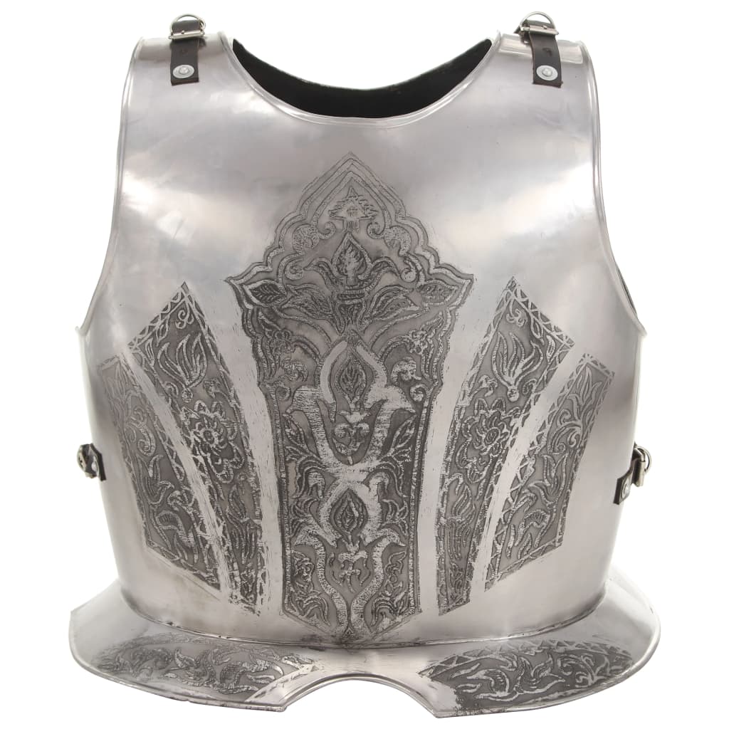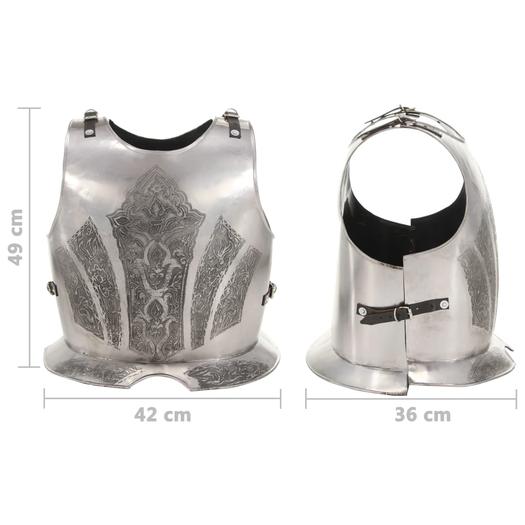Această armură este o replică exactă a unei armuri medievale originale de cavaler, oferind protecție atât în față, cât și în spate. Se poate purta fără probleme și este echipată cu curele reglabile din piele, pentru o ajustare confortabilă pe corp.